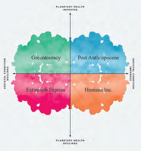 Figure 1: Arup’s 2050 Scenarios: The four divergent futures— Humans Inc., Extinction Express, Greentocracy, and Post-Anthropocene—range from the collapse of our society and natural systems to the two living in sustainable harmony. © Arup, 2019