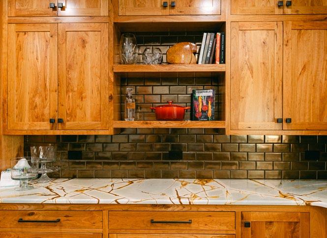 “The hood is real hammered copper and quartzite countertops... And then the backsplash is a cool, rusty subway, a little metallic to kind of play off the sheen of the copper. The hood is in the middle instead of against a wall. That