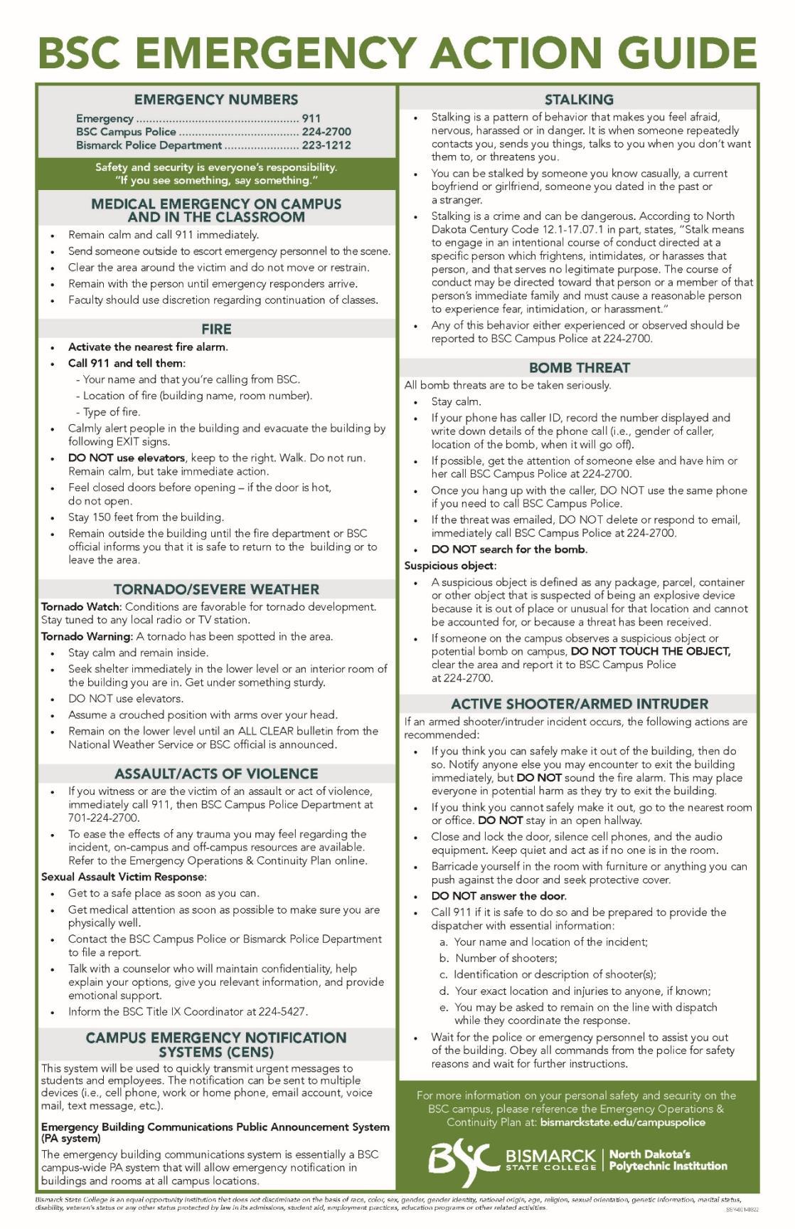 Emergency Response Guide: Quick reference charts for emergency situations posted in each classroom and office area at all BSC locations.