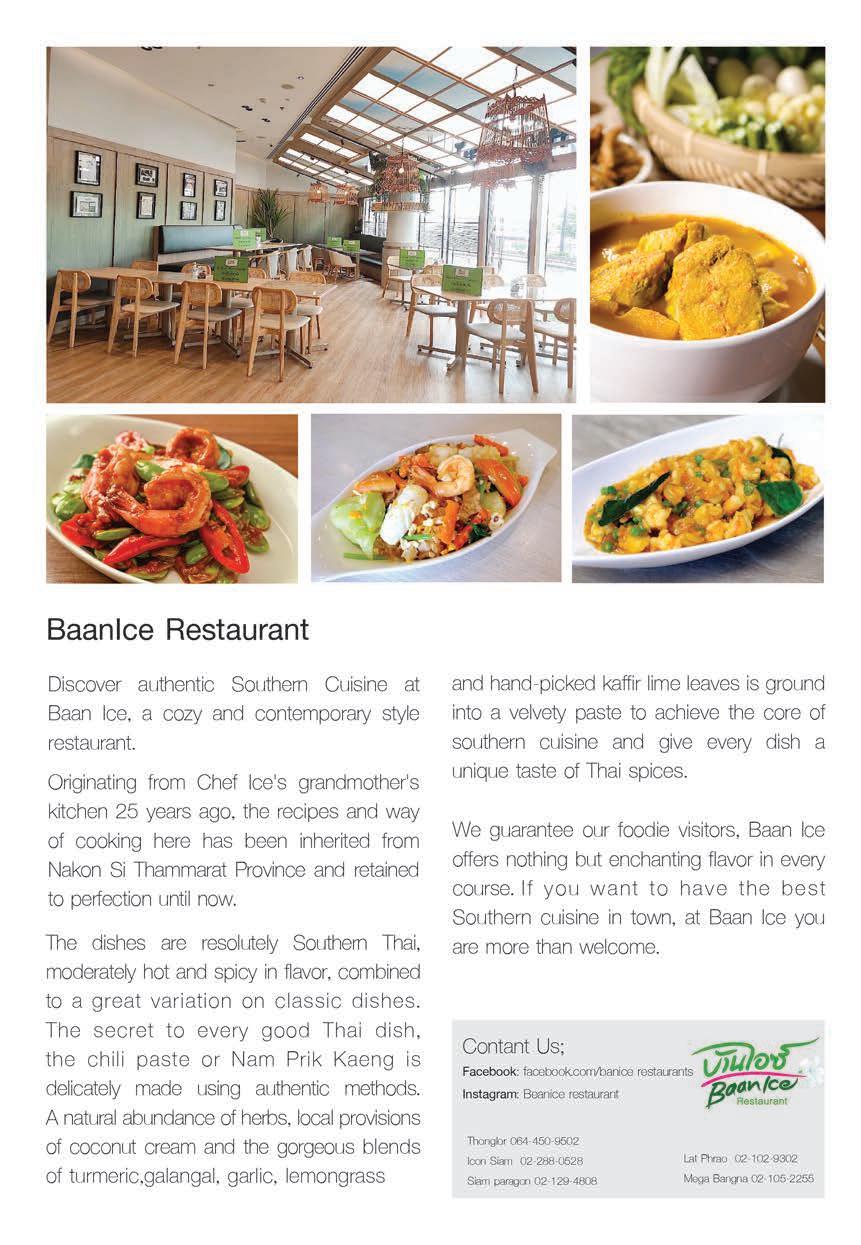 Baan Ice, with seven branches scattered throughout Bangkok, specializes in southern Thai cuisine with fiery spices and herbpacked flavors. People flock to the chain for traditional southern ingredients such as sator (stinky bean) and khao yum (southern rice salad). Not only are the main courses delightful, but the desserts are also a wonderfully guilty pleasure.