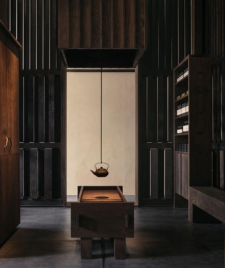 The traditional decor enmeshes itself perfectly with the minimal and classy packaging of amber bottles lining the walls, with Aesop’s complete range of formulations for the skin, hair, body and home. For visitors needing a more personalized consultation or time with the products, an en-suite basin tucked to the side enables one to try things out and pick favorites with ample ease.