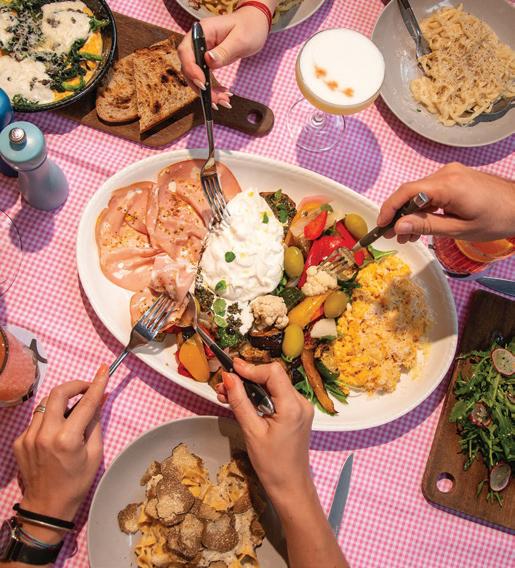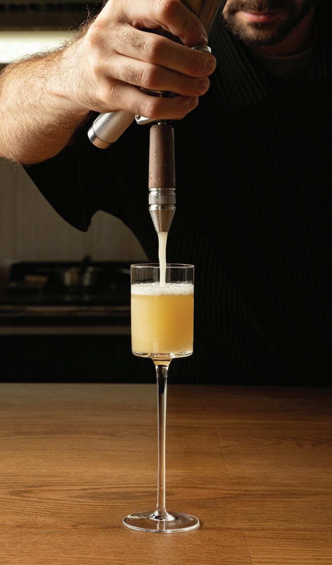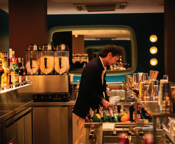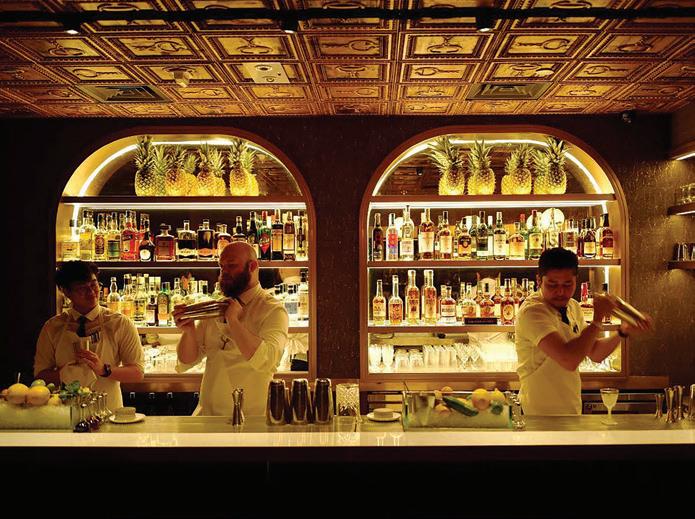 corner bar, and matte gold trimmings. Drinks include the Irish coffee, a classic with Irish whiskey, cognac tensaito (Japanese sugar), coffee, and cold cream. For a unique Daisy twist, try the Taling, a drink featuring pandan gin, baking spices, orange juice, and coconut water. And, of course, before you hit the club, don’t forget the food. Their quarter-pounder Wagyu is a crowd favorite. And, when the clock strikes midnight, guests are treated to complimentary freshly baked chocolatechip cookies, a perfect pairing with the Irish Coffee.