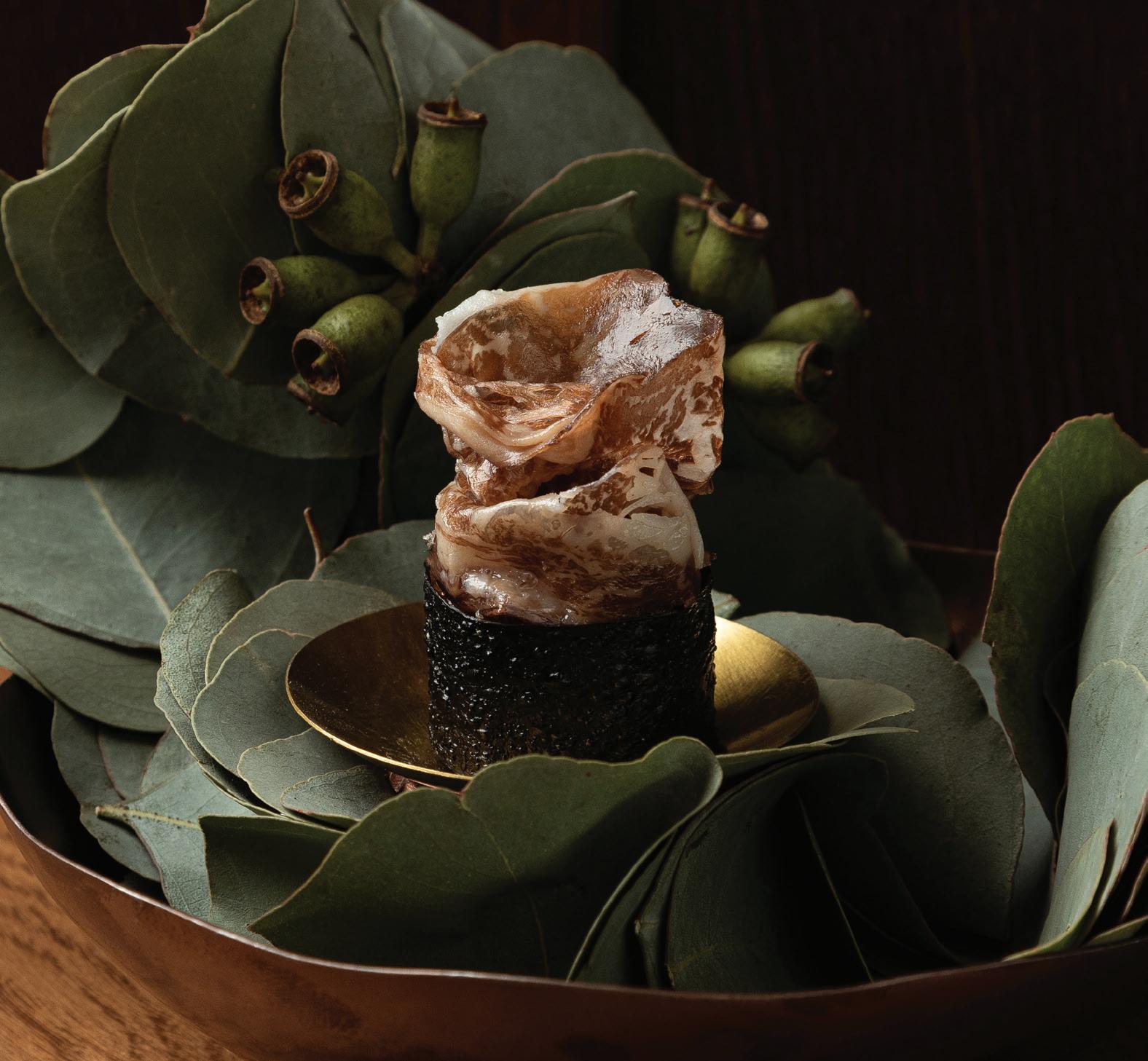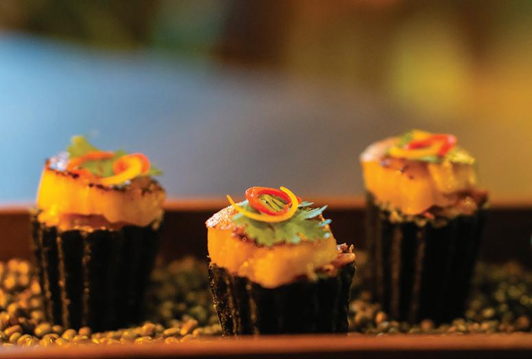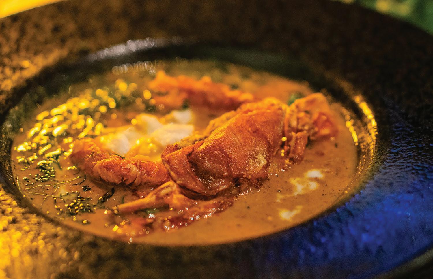 dinners. The 12-course meal, customized by Chef Tam and influenced by her travels from north, south, and central Thailand, takes place in a dimly lit but elegant room with earthy color tones and oak hardwood flooring. Zero waste and sustainability are the guiding principles of the menu. “Crab, Crab, Crab” is on the menu year-round despite many dishes changing with the seasons. It consists of three types of crab as well as lightly fried soft-shell crab, egg custard, and a Southern bamboo curry.