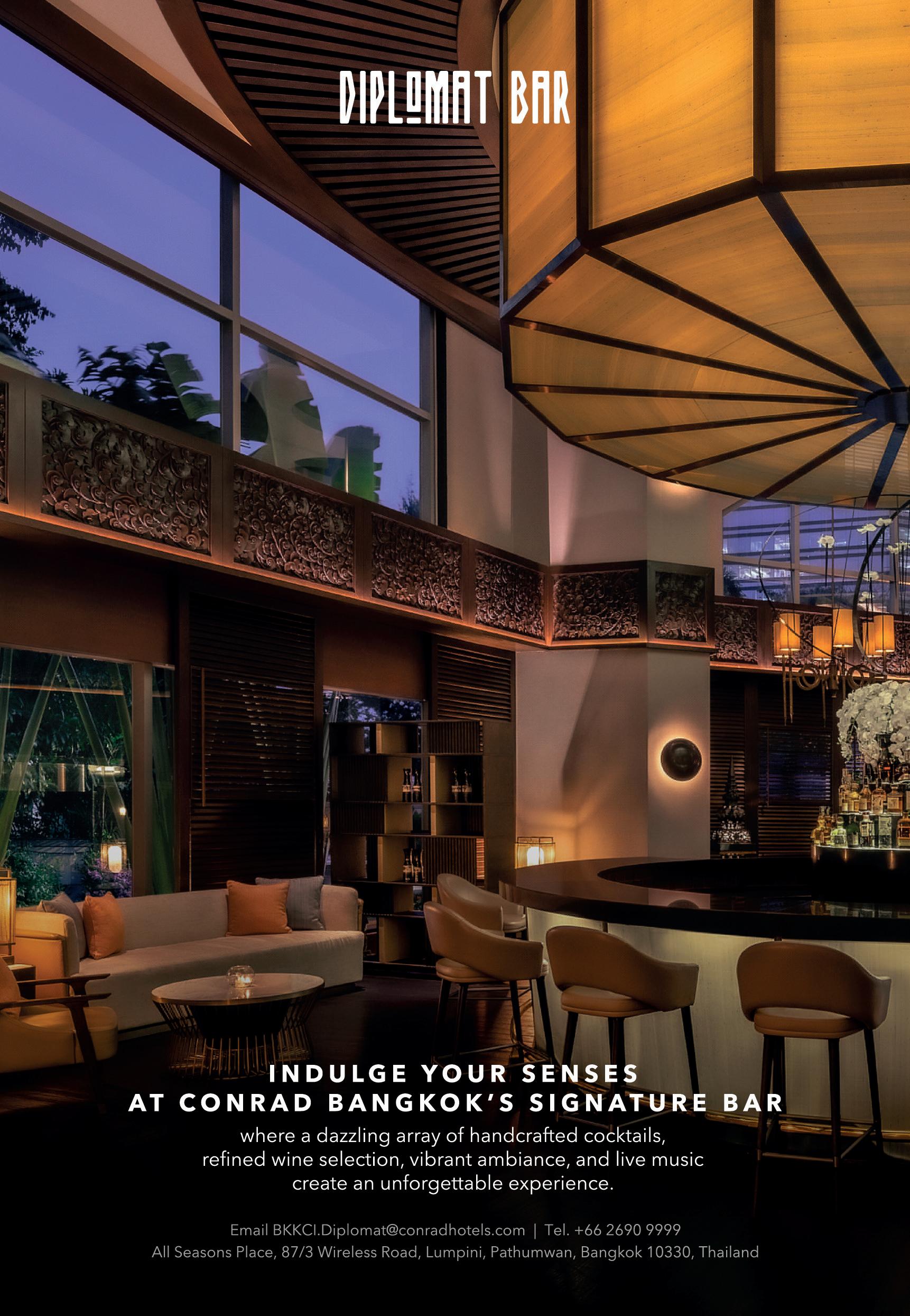 Conrad Bangkok’s Diplomat Bar offers a refined and sophisticated atmosphere. On deck are refreshing cocktails, a curated wine list, and delicious food options, ranging from sweet to savory, to suit cosmopolitan tastes and moods. The internationally acclaimed live band Elevate takes things to another level with their soulful tunes.