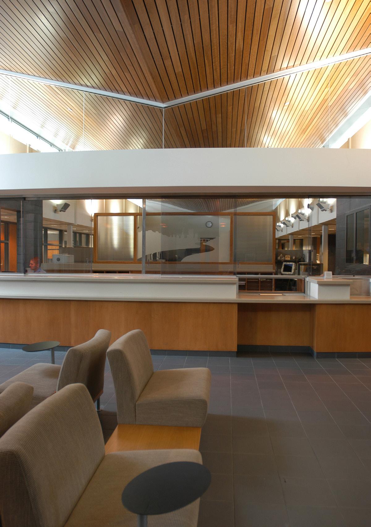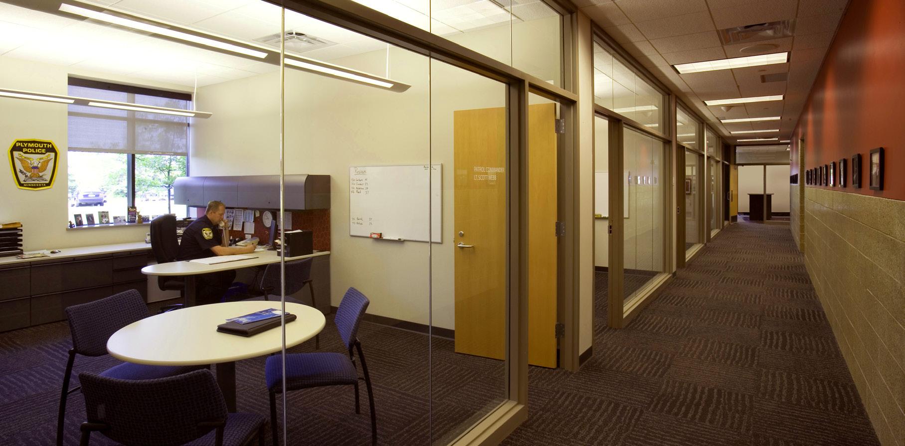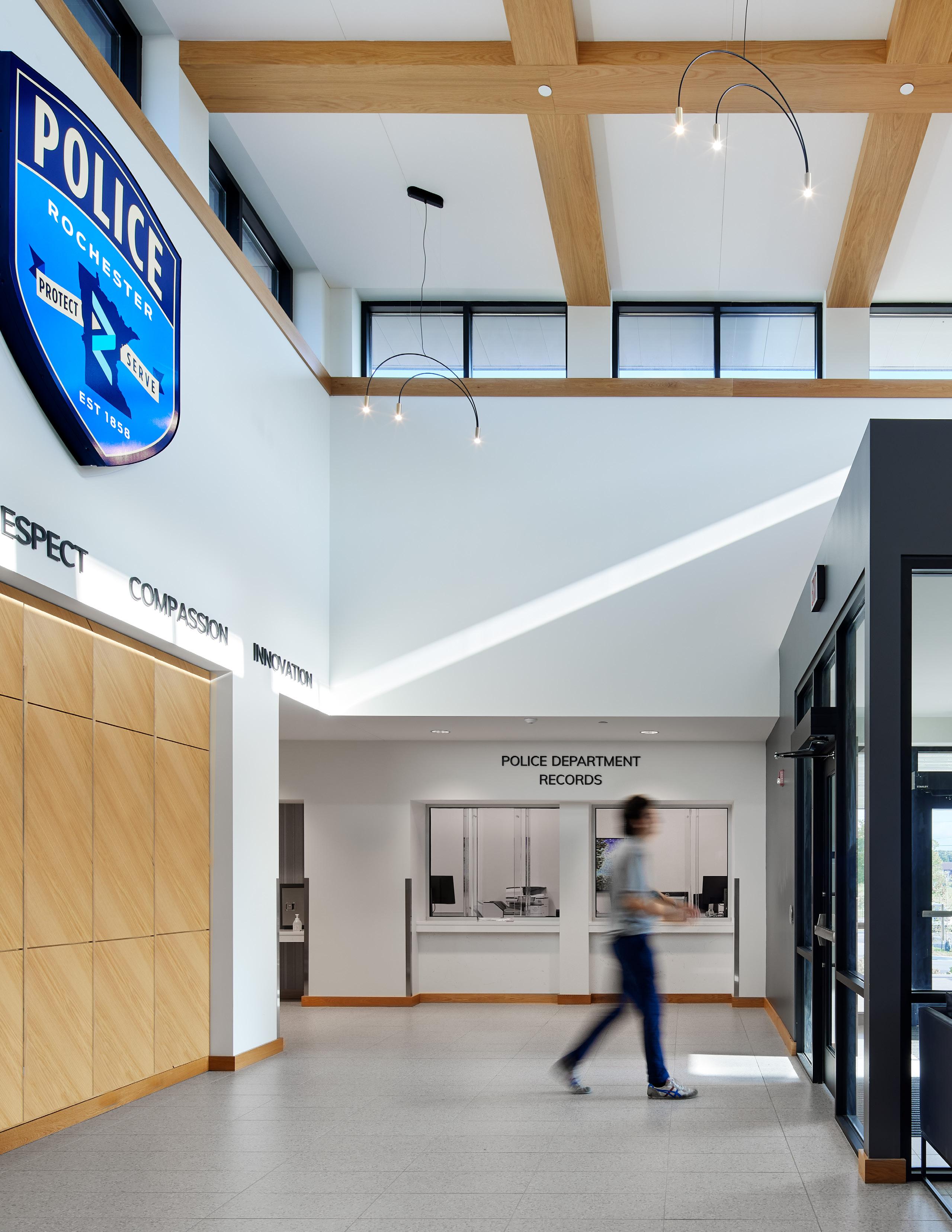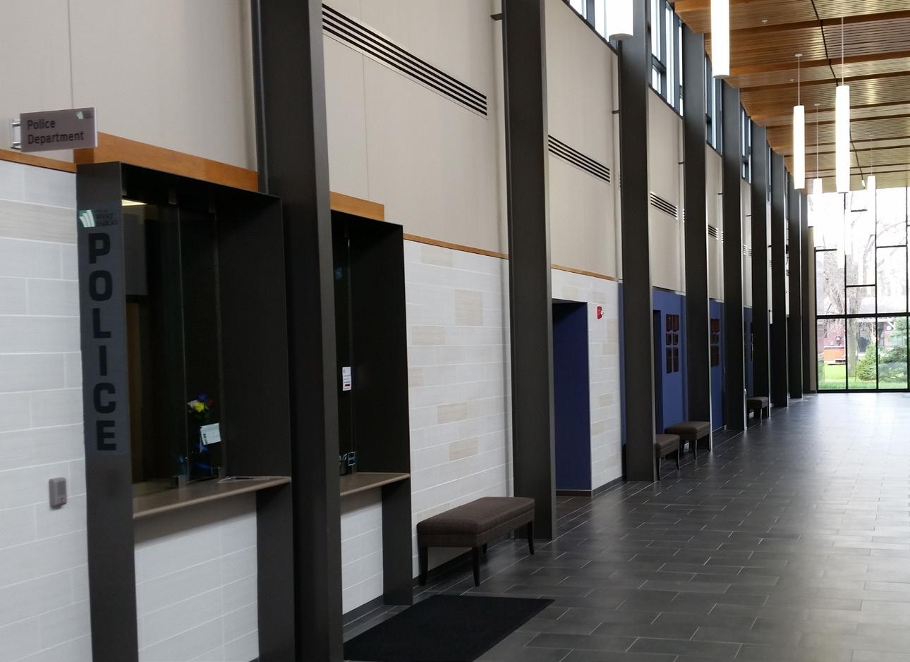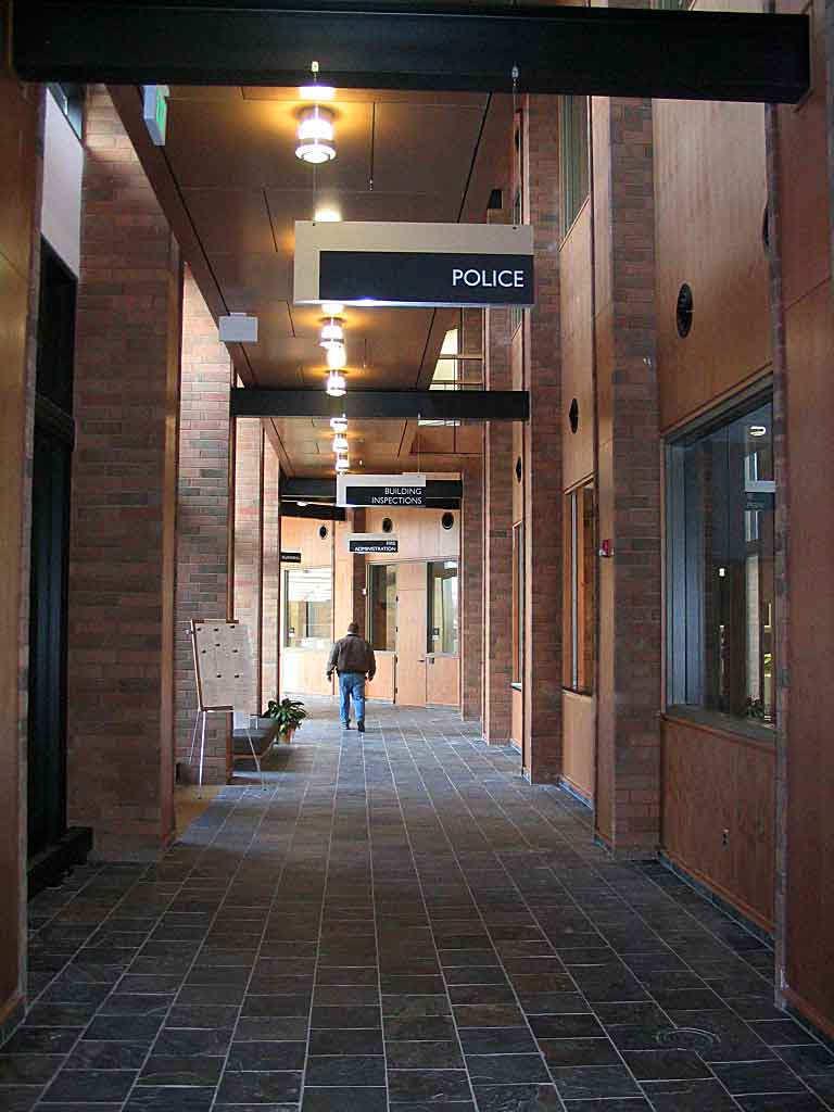 The police department, accessible through the main lobby, occupies two floors, with a secure 30-car squad garage underground. Administration for both city hall and the police department are linked through a bridge over the public lobby, merging separate functions discreetly.