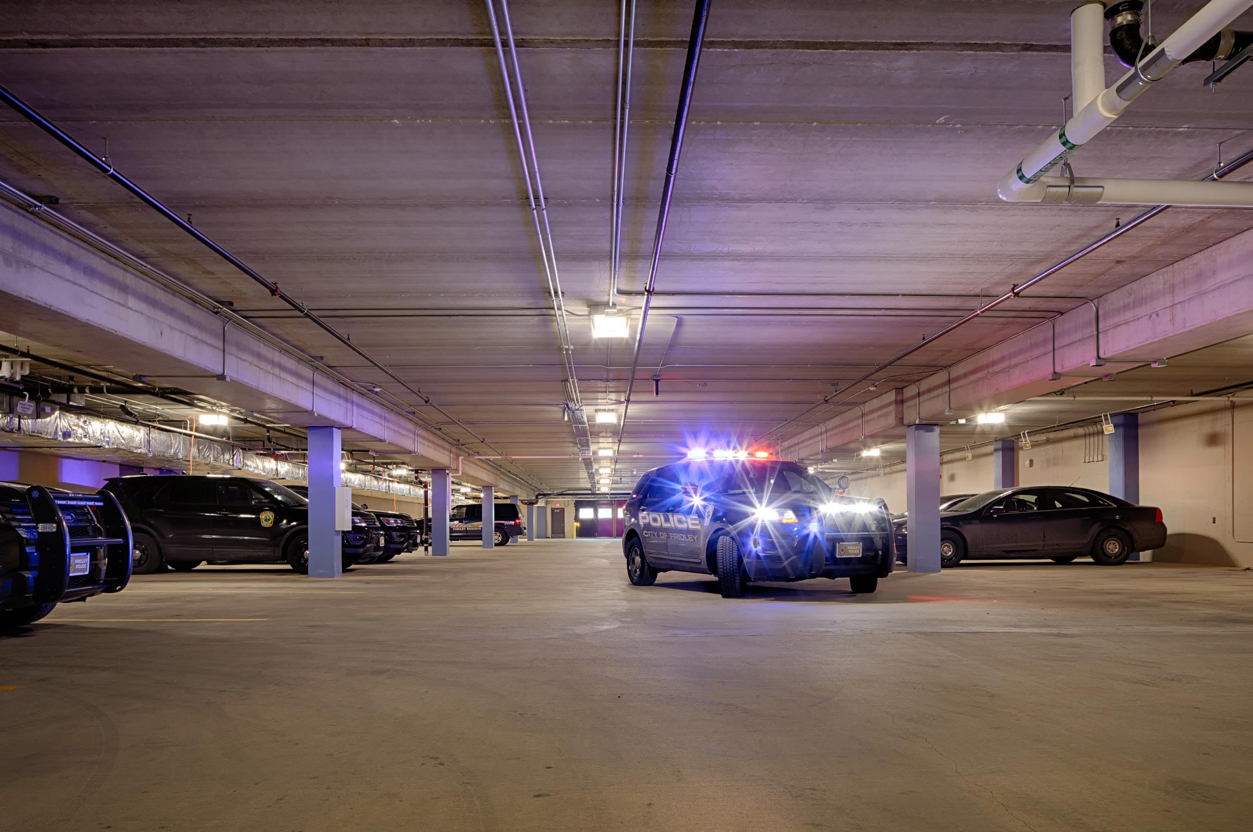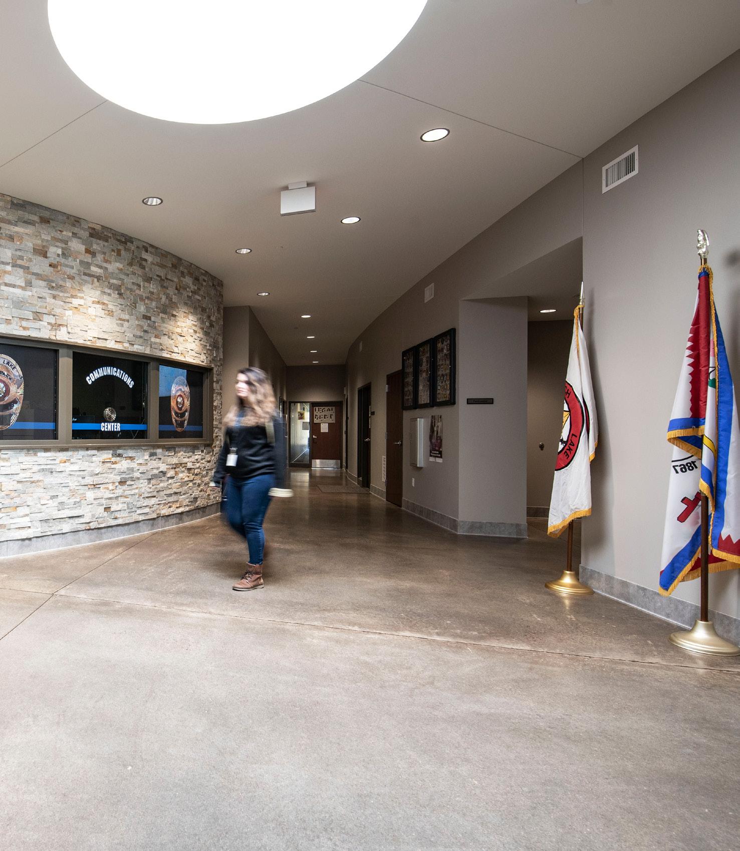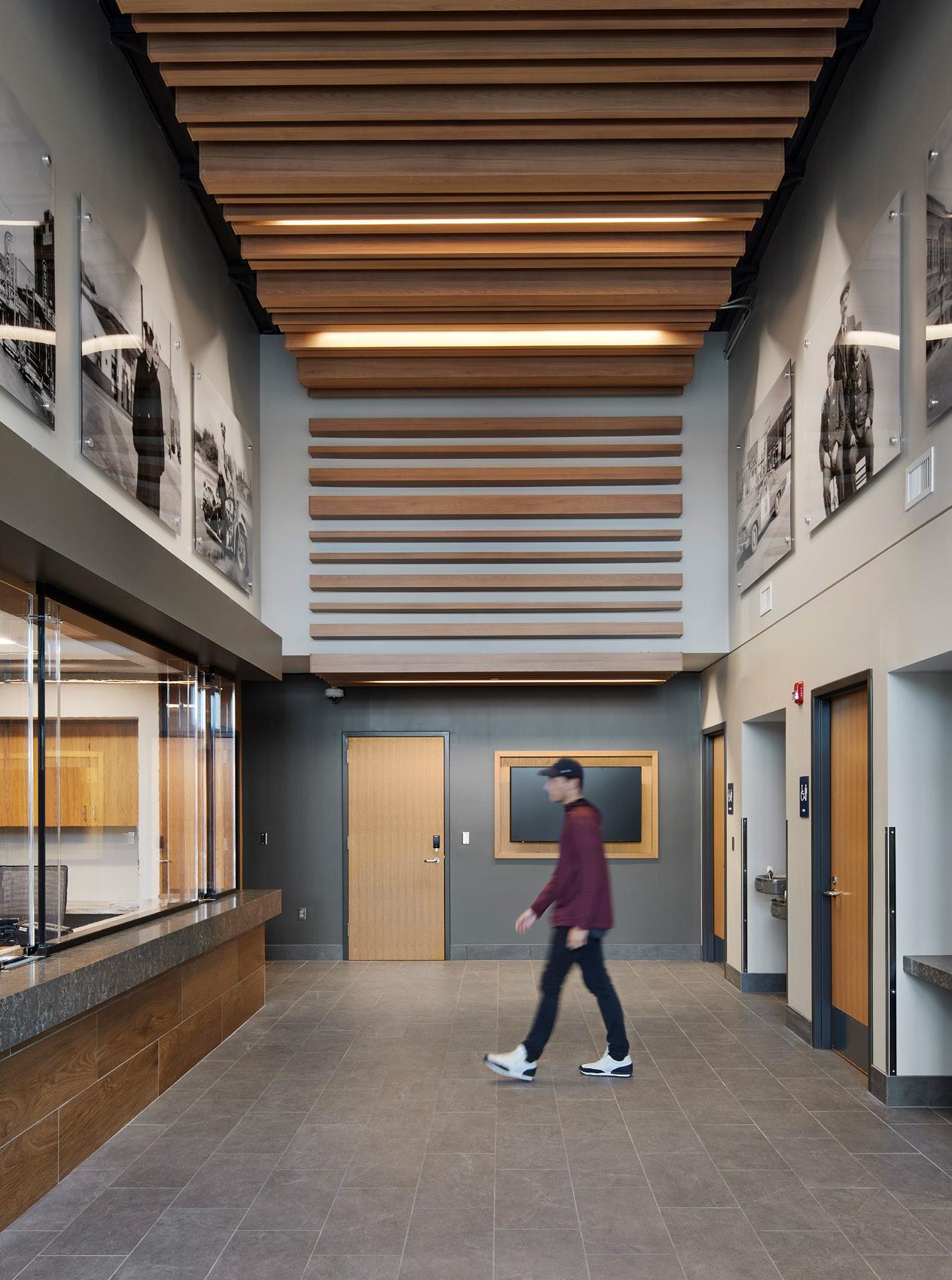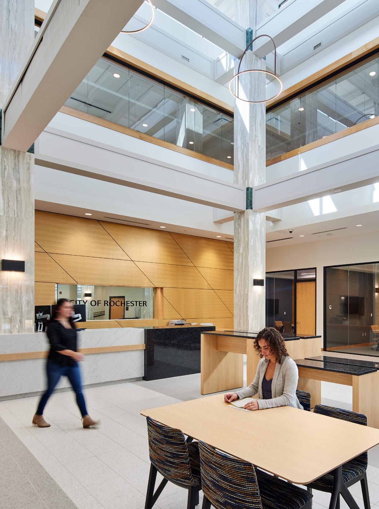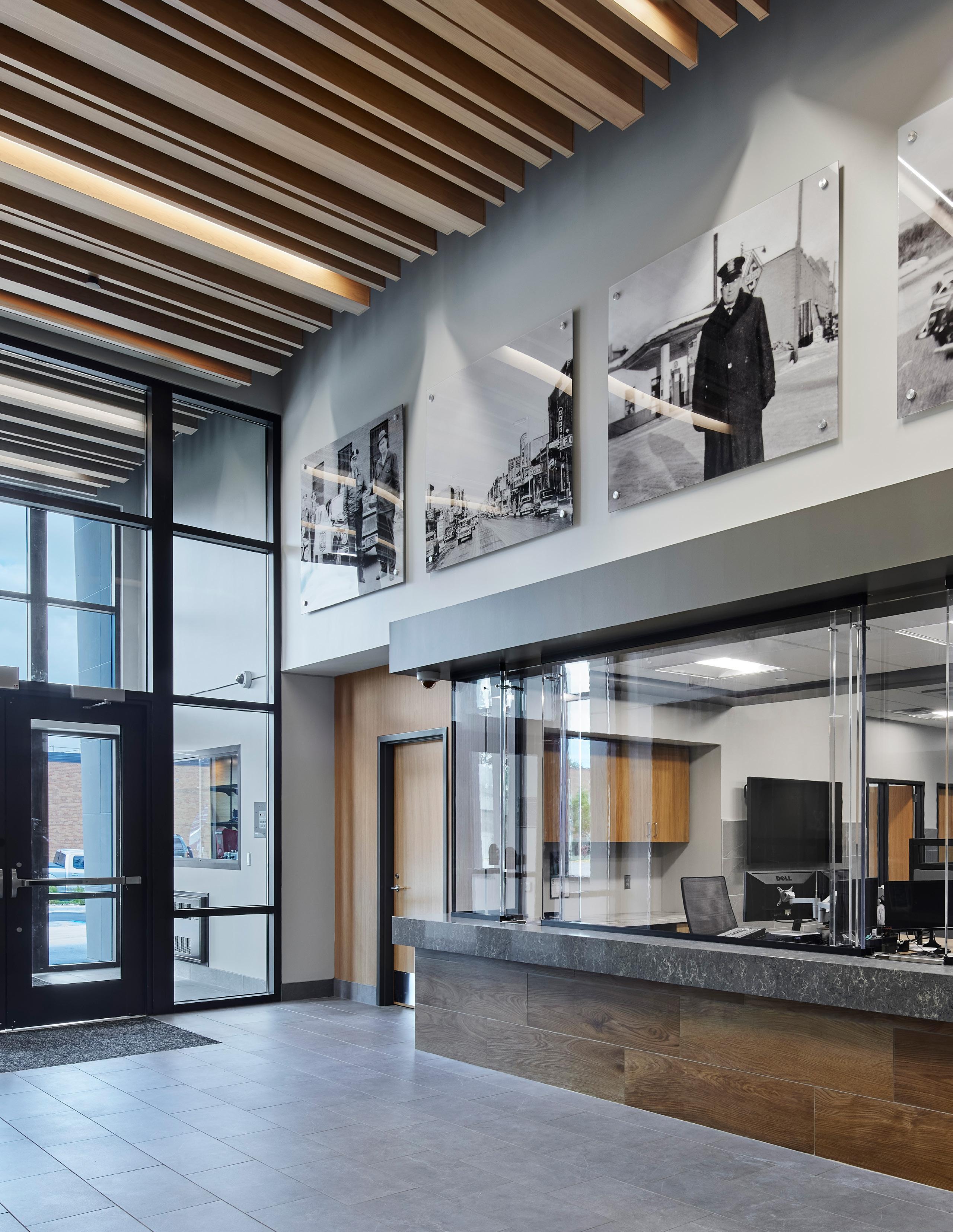The police department, accessible through the main lobby, occupies two floors, with a secure 30-car squad garage underground. Administration for both city hall and the police department are linked through a bridge over the public lobby, merging separate functions discreetly.