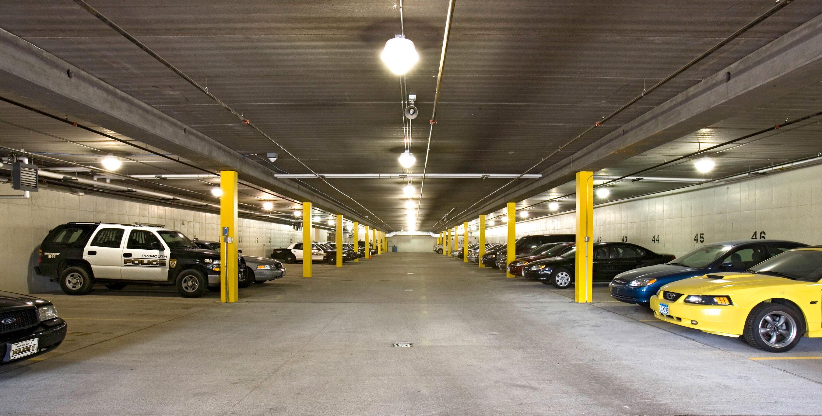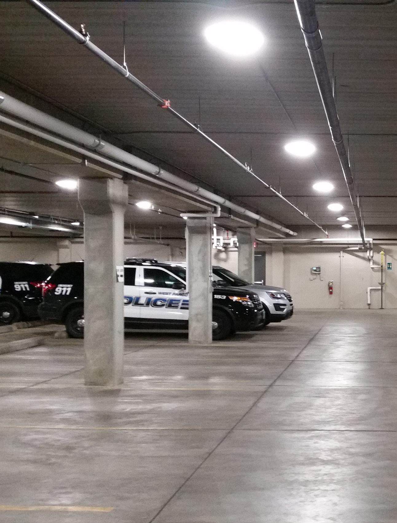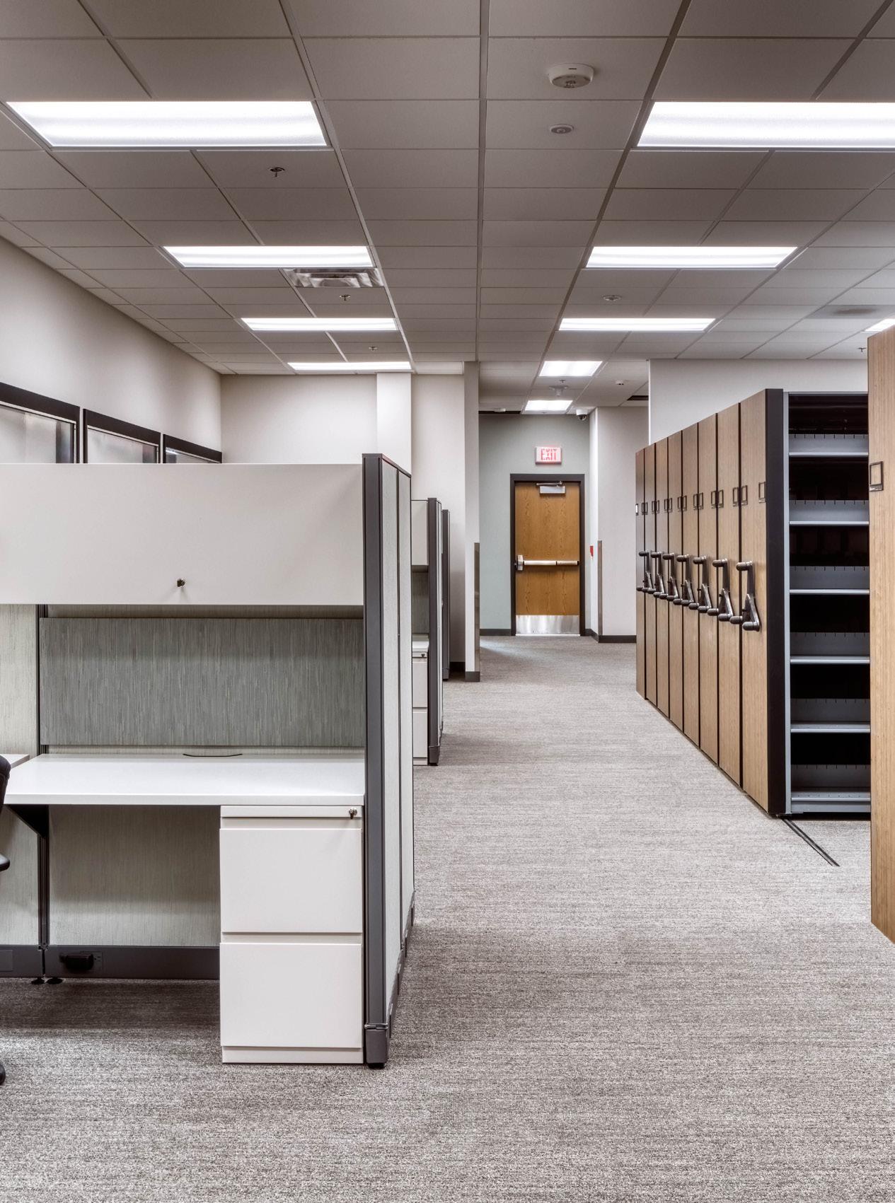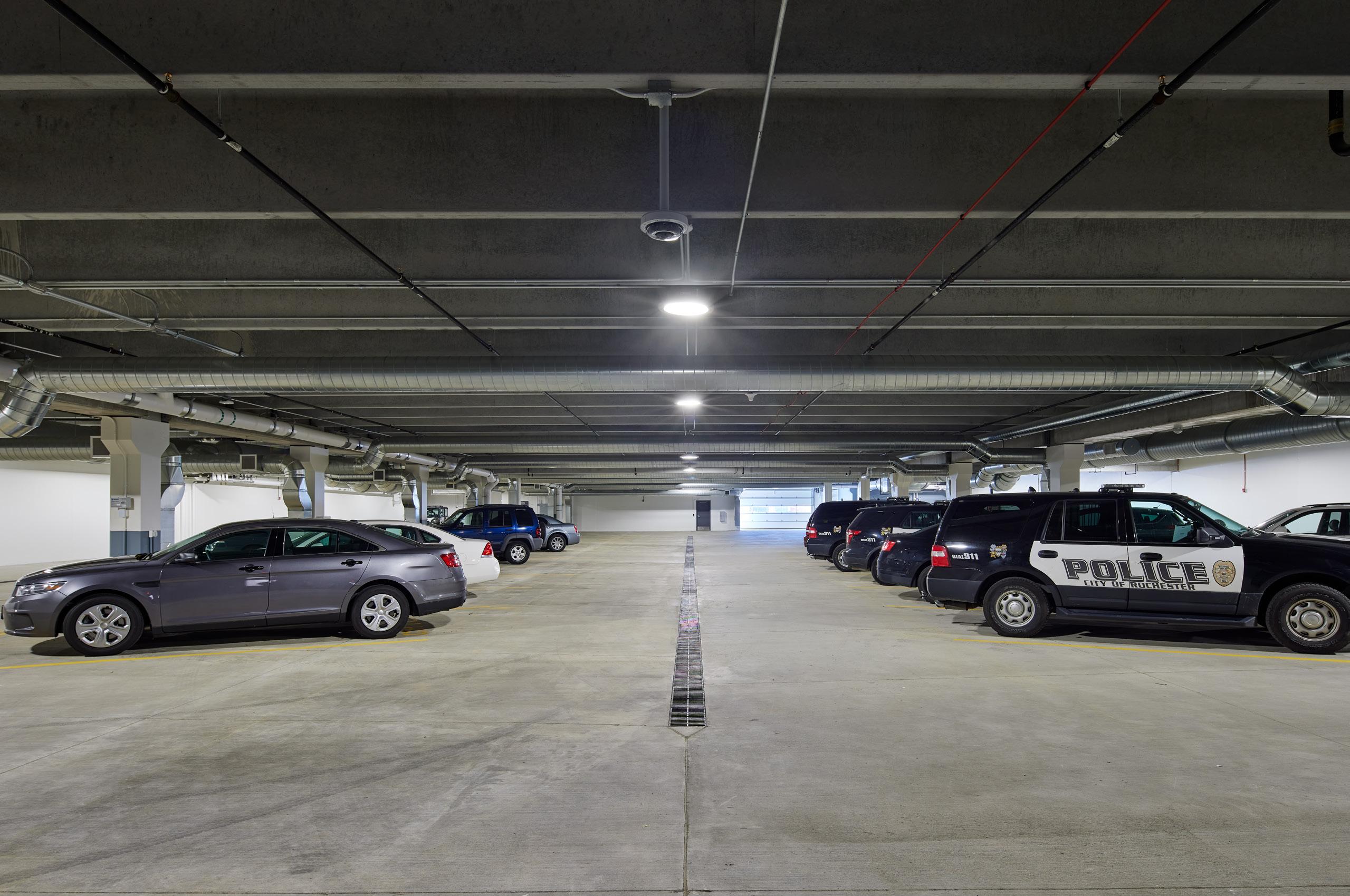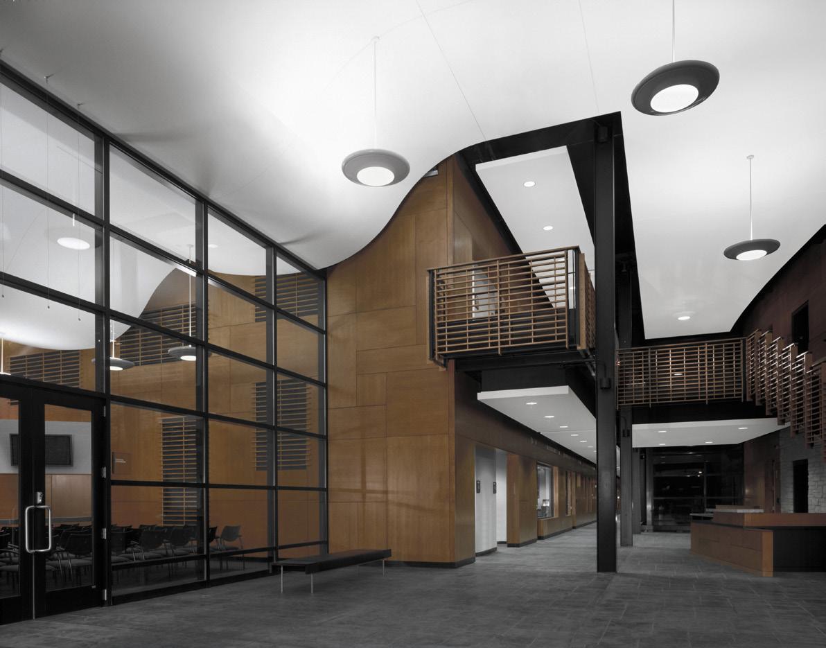 The police department, accessible through the main lobby, occupies two floors, with a secure 30-car squad garage underground. Administration for both city hall and the police department are linked through a bridge over the public lobby, merging separate functions discreetly.