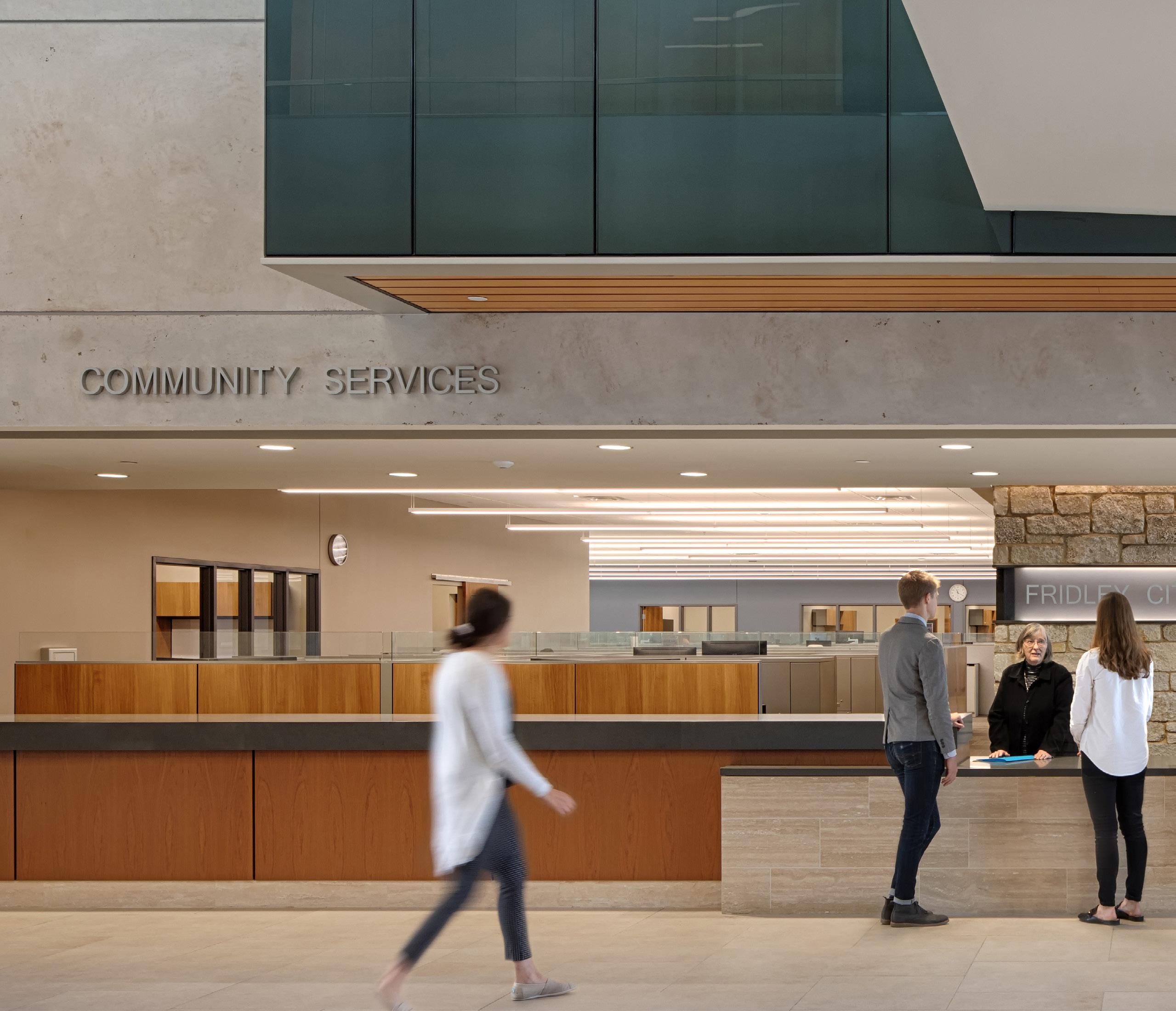 The council chambers, reminiscent of the original ‘grange’ hall, serves as a gateway to the City. City government and law enforcement meetings are transparently conducted and visible to its constituents. The lobby spans two floors eastward, granting access to city department suites. With its fully glazed south-facing walk, it offers a connection and overview of the city.