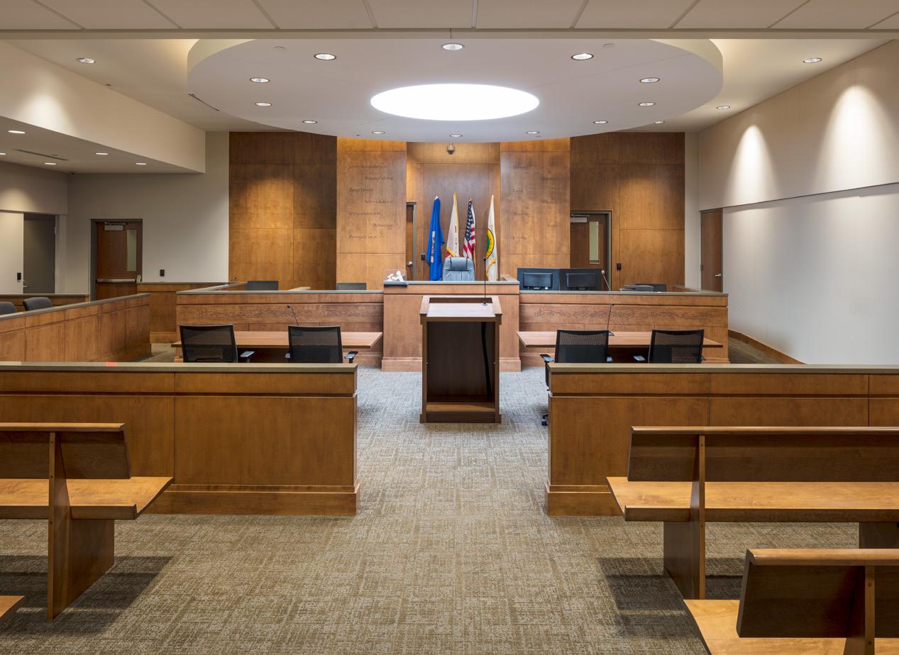 The facility features a combined Sheriff’s Office/Courthouse entrance with full security screening. Each Courtroom / Hearing room is entered by a sound lock vestibule flanked by two attorney/ client conference rooms. Public spaces are efficiently arranged, including a jury assembly room across from security, various attorney/ official offices, mother rooms, family rooms, and training spaces and classrooms for law enforcement on the fourth level.