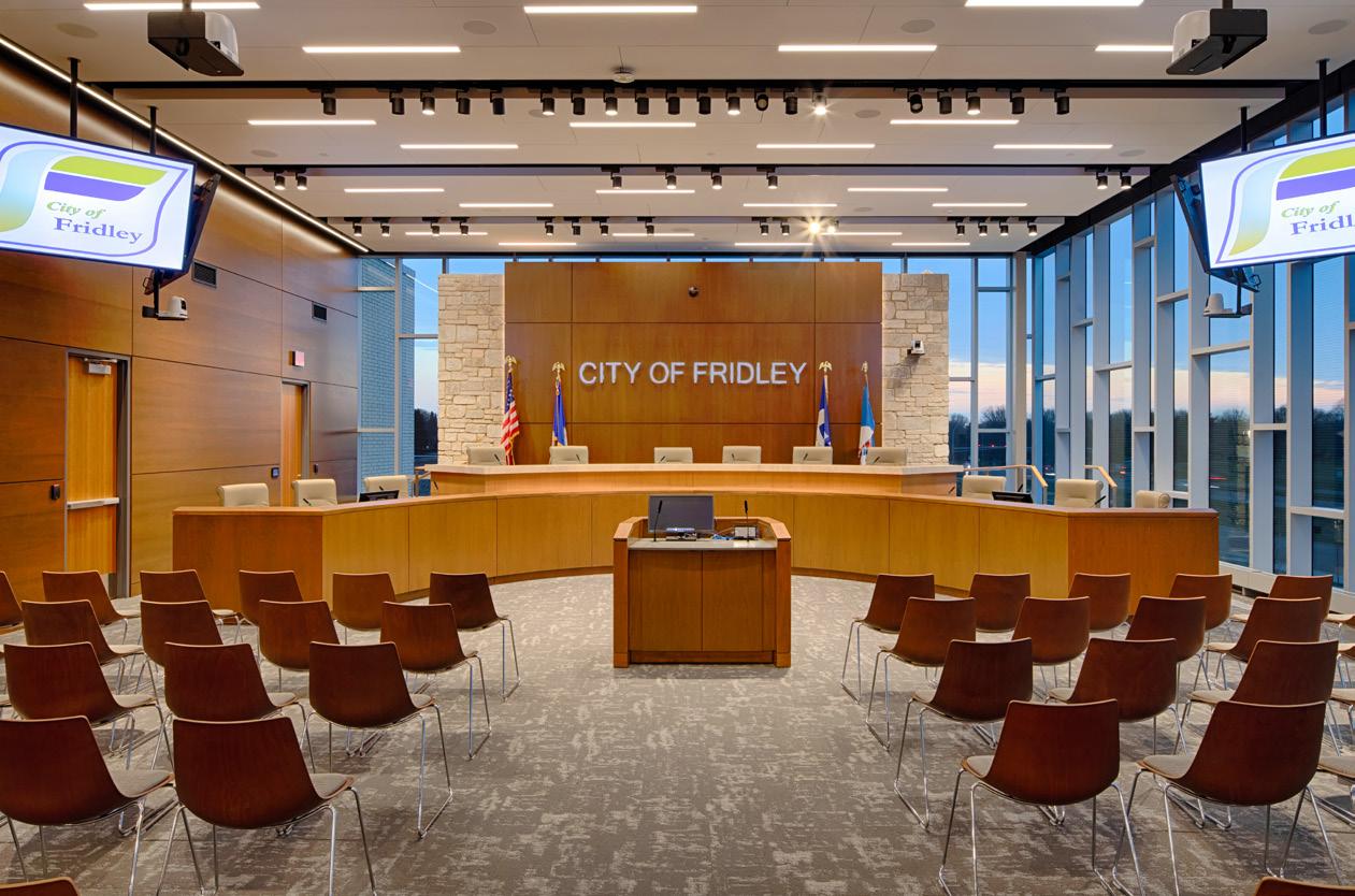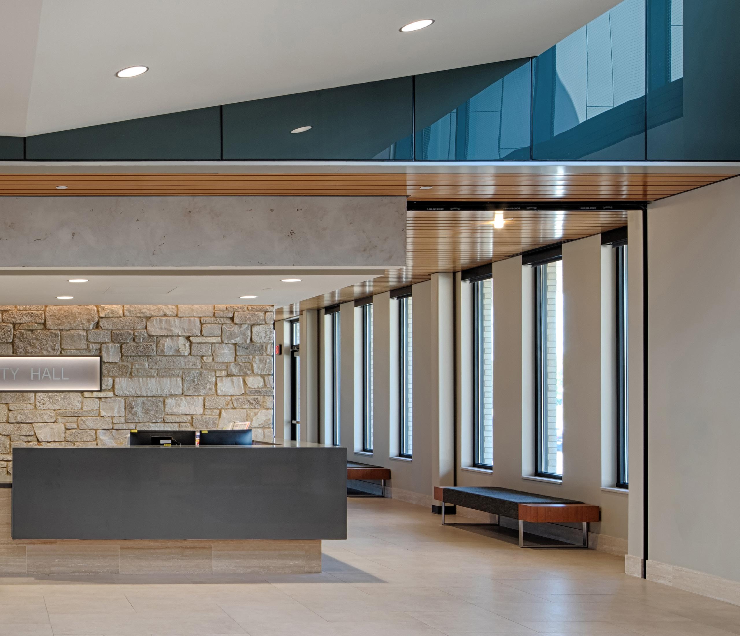 The public safety wing houses the police department and fire department administration. It includes offices, holding facilities, locker rooms, support spaces, and a 10-stall enclosed and secured garage for police vehicles. The city hall wing has been remodeled to include expanded office space for city departments including administration, finance, community development, public works, and engineering, as well as needed support spaces. An enlarged council chamber, lobby, and public circulation space connect the various components.