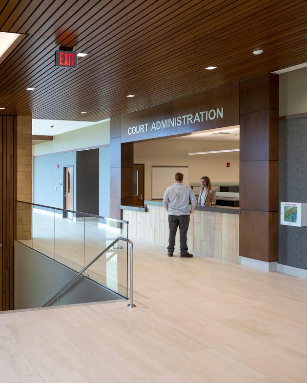 The 80-bed jail portion of the project has separated vehicular flows and parking for staff, in-custody, services, and the public and provides core services for programs, dining, laundry and work release. Throughout the facility judicial staff circulation is separated from public, inmates are securely circulated from the jail to the courts through secure elevators into courts holding, and full security screening is provided for public. Core jail services were sized and located to support future expansion.