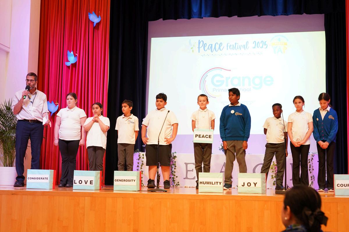 Grange Primary School. Theme: The Future we Imagine. Through a powerful role play the YAPs demonstrated how fear, sorrow and hate can be transformed by peace into positive virtues like humility and love! The Headteacher shared how both YAPs and adults had benefited from the project.