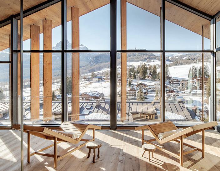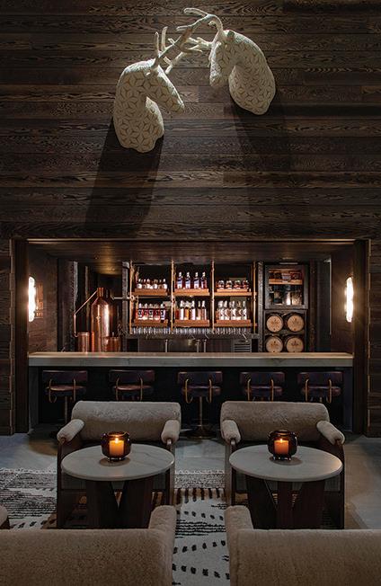 紙の色調をそろえた本や置物が並ぶ本棚 などが配され、くつろげる雰囲気だ。そして その多くは地元で調達されたものである。 新しくできたバスハウスにあるのは、塩 水プール、温浴槽、スチームルーム、サウナ ルームなど。天井は見上げるほど高く、自 然光がたっぷり差し込む大きな窓の外には ロッキー山脈の雄大な景色が広がる。温 熱療法プールを囲む温熱石材タイル敷き のフロアで提供されるのは、雪景色を見な がら行う瞑想やヨガなどのクラスだ。この 他、スパでは雪の冷水浴や温熱セラピー、 冬季限定のマッサージ「Fire and Ice」(温 めた河原の石と緊張をほぐす施術で免疫 力を高め、毒素を流す)などのヒーリングメ ニューが用意されている。 少人数制ホテルのため、スパでのトリート メントから森林浴体験まで、ゲスト一人ひ とりの要望にきめ細かく応じてくれるのもう れしい。常緑樹の林をスノーシューで歩く 森林浴では、シカやイタチが雪に残した足 跡が見付けられるだろう。滞在中の食事 は、季節の食材を使った日替わりメニューと なる。メニューに載っていなくても、こういう 場所ではめったに出されないベトナム風サ ンドイッチのバインミーなど、好きな料理をリ クエストすることも可能だ。