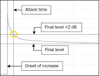 Attack time: The time interval between onset of an increase in level and the point when the output level has stabilised to