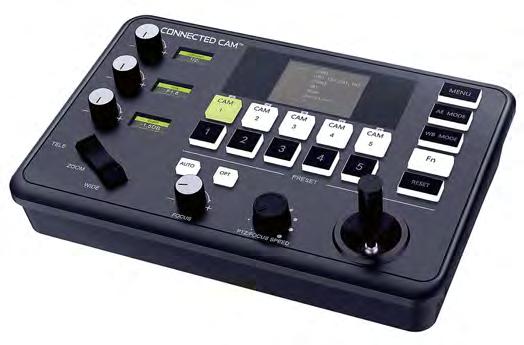 Available as part of a bundled package with two or more JVC PTZ cameras, the RM-LP5G Connected Cam PTZ joystick controller features a dual-axis joystick and zoom bridge and can manage up to five PTZ cameras. Its four-colour LED multiscreen is designed to simplify setup and operation, and it supports VISCA, UDP and PELCO P/D control protocols over IP, RS-422 and RS-232.