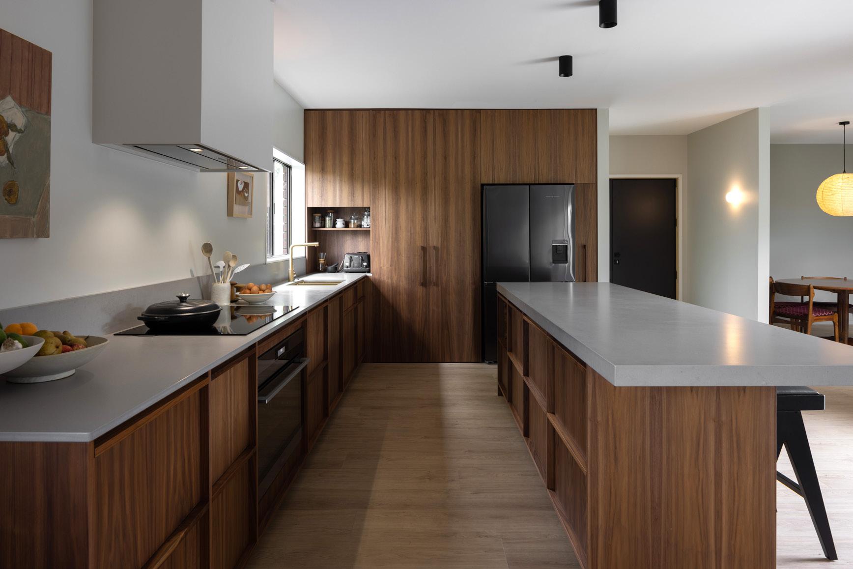 blackwood flooring and glass sliders connect inside and out. Bifold windows in the kitchen ensure it’s easy to cater for barbecues, while the large scullery keeps things tidy.
