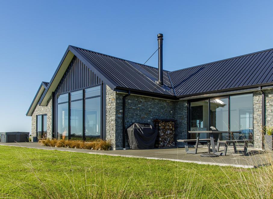A mix of schist and coloured steel vertical cladding gives this Pleasant Point home a particularly delightful perspective. That theme is continued through the use of charcoal steel roofing — its dusky shade providing an elegant colour and material contrast to the mineral brick and stone below.