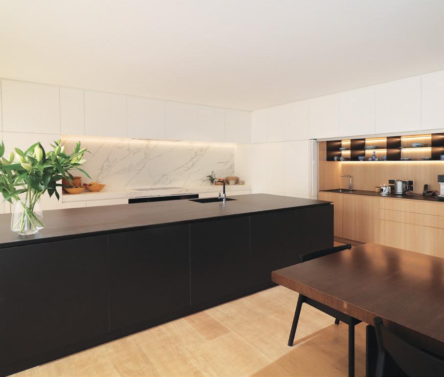 Turn left and you’re in the open-plan part of the house with a smart, monochrome kitchen that’s all clean lines and streamlined surfaces. A mosaic-tile splashback lends texture; a separate pantry provides plenty of storage. On the other side of the pantry walls and off a central hall are a study nook and separate laundry with its own