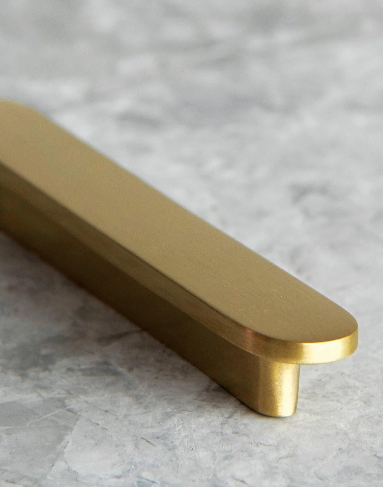 The soft curves of these sturdy satin-brass handles take inspiration from the art-deco era.