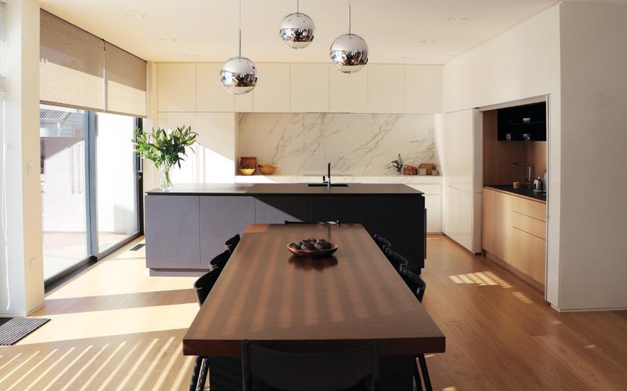 In the kitchen, a sliding window opens to the deck – just the thing for passing out food and drinks during the barbecue season. White tiles complement the graphitetoned kitchen benchtops and charcoal cabinetry.