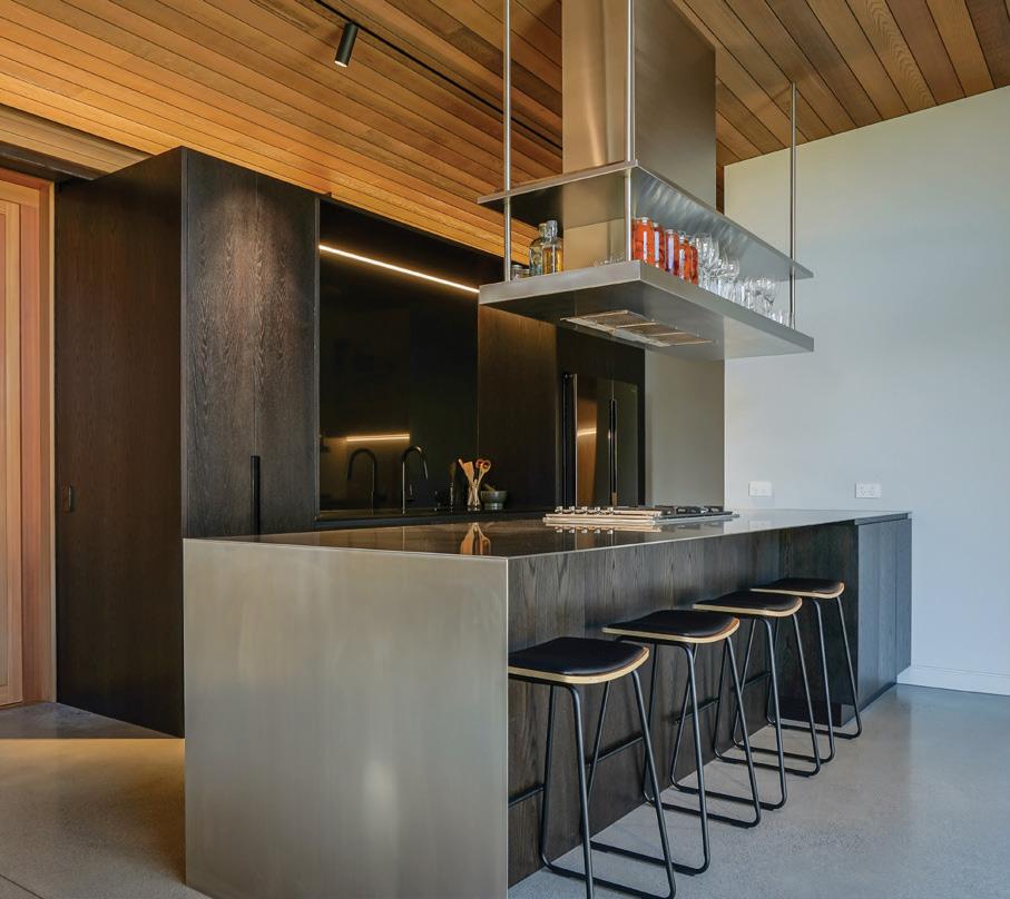 sunlight throughout the day, and decks and patios wrap around the single-level property making it ideal for alfresco dining, get-togethers and relaxing. It’s fair to say the timber- and plaster-clad home has a lot going for it. Inside, sophisticated, warm and comfortable spaces abound. The modern kitchen has stone benchtops, a butler’s pantry and quality joinery; the two bathrooms, including an ensuite, exude understated style.