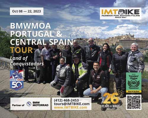 POSTMASTER: SEND ADDRESS CHANGES TO BMW ON, 2350 Hwy 101 South, Greer, SC 29651 ©2023 by BMW Motorcycle Owners of America Inc. All information furnished herein is provided by and for the members of BMW Motorcycle Owners of America, Inc. Unless otherwise stated, none of the information (including technical material) printed herein necessarily bears endorsement or approval by BMW MOA, BMW NA, the factory or the editors. The editors and publisher cannot be held liable for its accuracy. Printed in the USA. Volume 53, Number 7