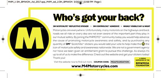 BMW ON (ISSN:1080-5729) (USPS: 735-590) (BMW Owners News) is published monthly by BMW Motorcycle Owners of America Inc., 2350 Hwy 101 South, Greer, SC 29651. Periodicals postage paid at Pewaukee, Wisconsin and additional mailing offices. Opinions and positions stated in materials/articles herein are those of the authors and not by the fact of publication necessarily those of BMW MOA; publication of advertising material is not an endorsement by BMW MOA of the advertised product or service. The material is presented as information for the reader. BMW MOA does not perform independent research on submitted articles or advertising.