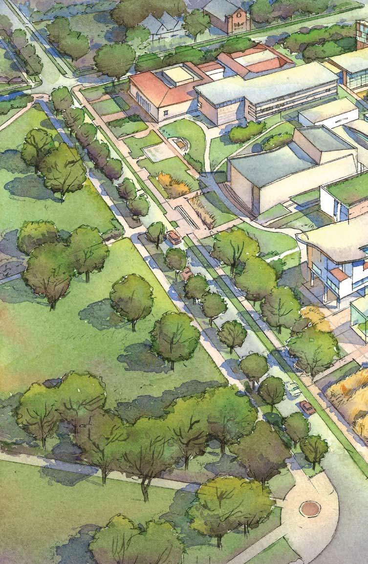 The relationship of the Green Arts District to its surroundings is an important part of the overall design. The proximity to downtown and Tappan Square provide opportunities to build connections and strengthen the fabric of the built environment. The building frontages reinforce these connections. Based around the existing quad system on campus, the Green Arts District complements the existing campus patterns.