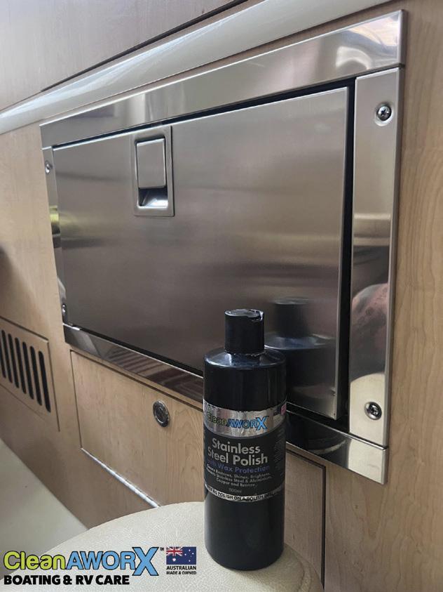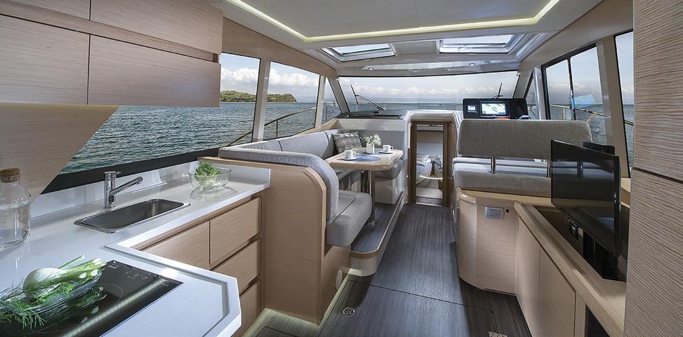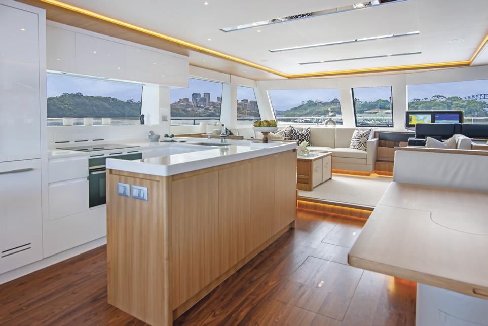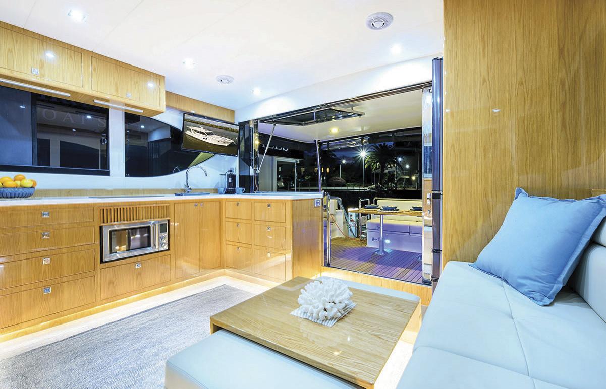 and watching TV. Opposite is a fully equipped state-ofthe-art galley with plenty of bench space, a deep single sink, a full-height fridge, and ample storage – so you can prepare meals or refreshments without ever leaving the conversation. Perfect for entertaining guests.