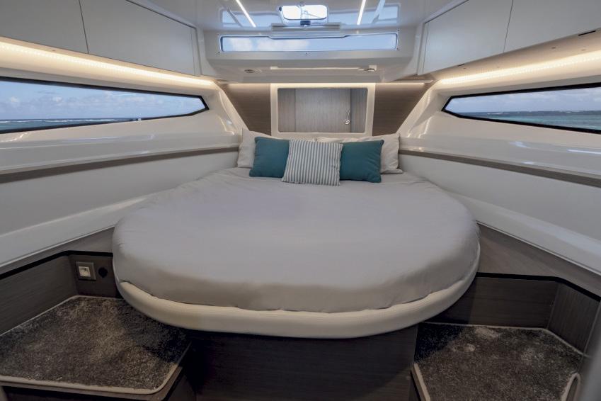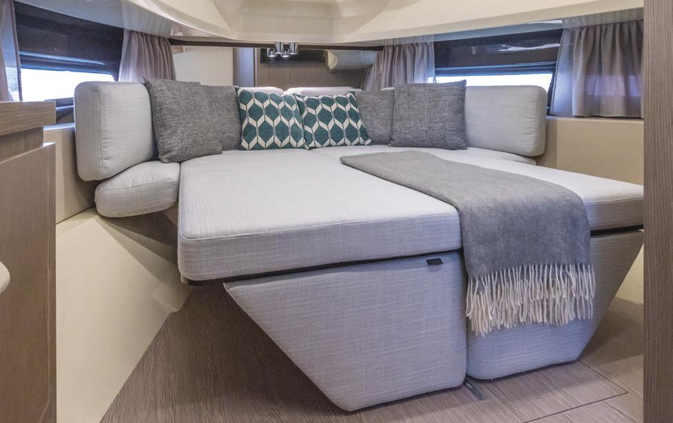 There are three rear configuration options on this model; on display was one offering a rear bench and below floor storage, another offers a U-shaped seating dinette that converts to a sunbed, and the aft cabin option with a large glass rear window for kids or friends to sleep in their own private second cabin.