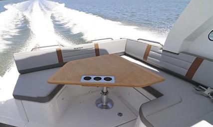 Walking us to the bow we noted the forward-facing sun lounge seating and two well-placed sound system speakers, creating an incredibly relaxing space for sunset drinks or even a cruise at high speed.