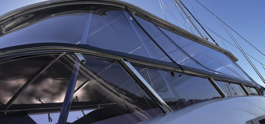 Other standard features include a stainless-steel swim ladder, hydraulic steering, bowthruster, and zipper front window in the sprayhood.