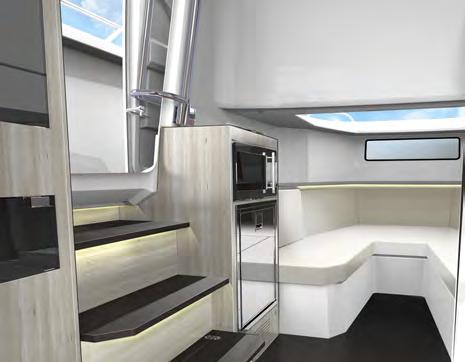 Two more completely new features stand out on the main deck below. A large 3m-long balcony folds down out of the bulwarks on each side of the cockpit, creating an entirely new dimension to the relaxation options here. While the balcony invites you to dive into the sea alongside, it also creates the opportunity for a sofa, built into the cockpit coaming. In effect, it adds two ‘side cockpits’ to the main cockpit.