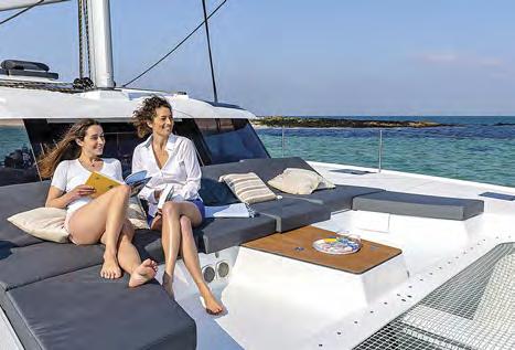 On deck, guests can spread out over a large seating area with a drinks-cooler fridge accessible from the cockpit, flowing into the saloon and galley, with a wellequipped kitchen and dinette with seating for up to six people. The large foredeck is a great place to relax, with convertible sunpads/lounges.