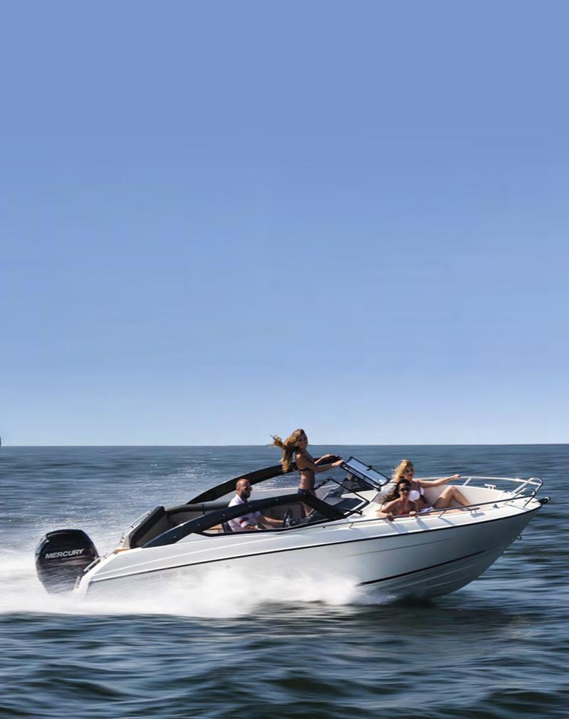 A wide range of outboard engines is available, typically a pair of 150 hp or 300 hp for sparkling speeds and a comprehensive list of additional equipment. The power options are completely up to you. While twin 150s are a popular choice, those keen on their watersports can double that with a twin 300 hp set-up.