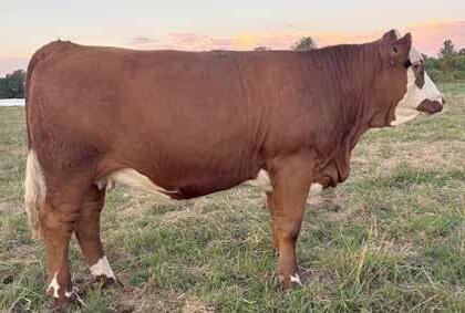 Shadow is a tremendously thick, deep solid red heifer out of a black cow. She is one of those heifers that needs to get her scratches whenever she can and usually must be pushed out of the way. Longevity is a trait that runs in her family with her granddam leaving at 17 years of age. Her calf by Century Lincoln 310L (Rugged R Cavill x Sibelle Sugar Ray) should be an exciting prospect. Bred to Century Lincoln 310L on May 21, 2025 Ultrasound safe in calf