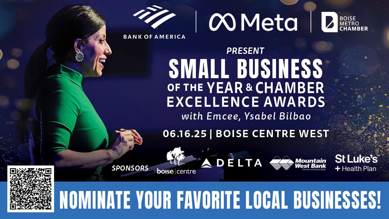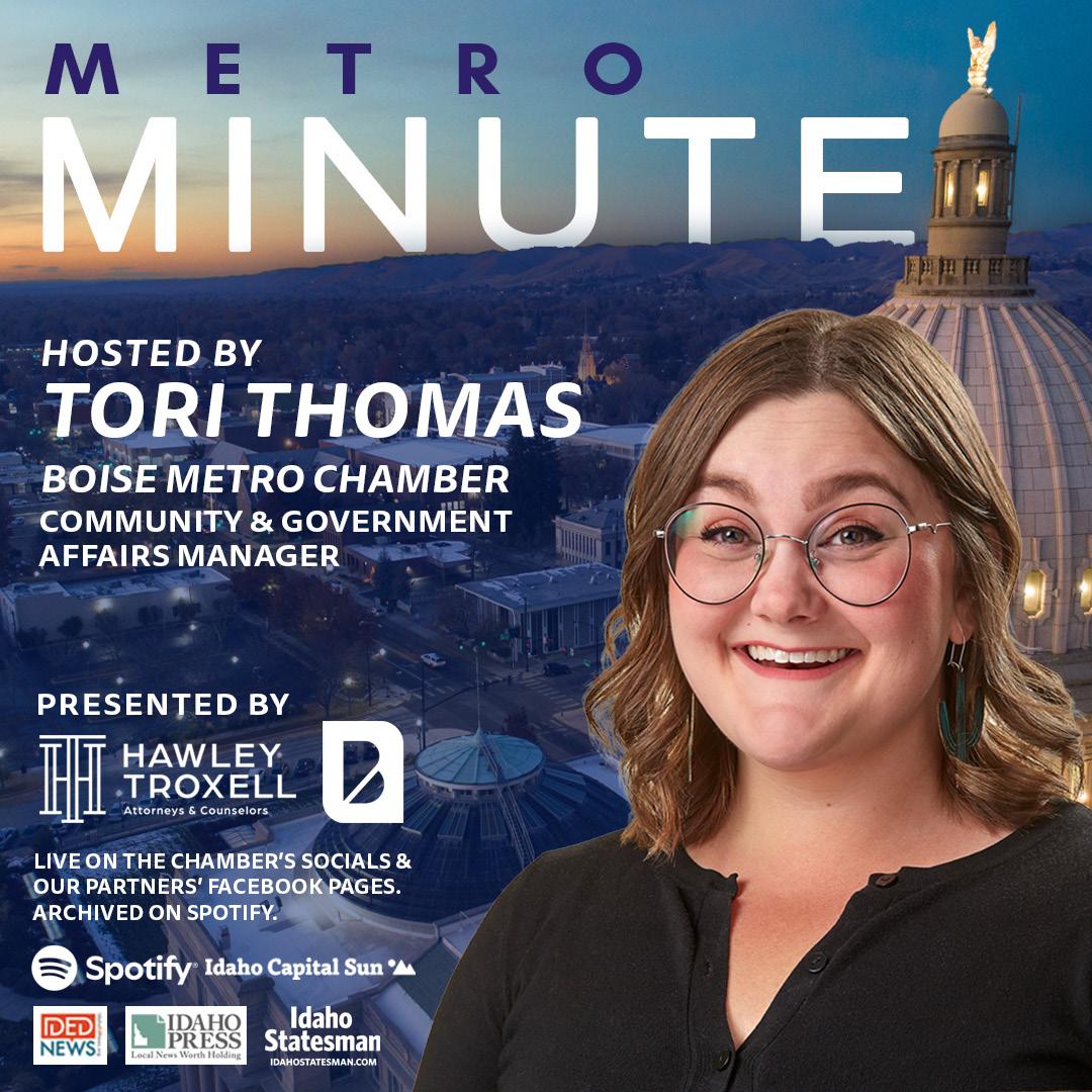 1101 W. Front St., Suite 100, Boise, ID 83702 | (208) 472-5205 Boise Metro Connection (USPS 227-520) is published bi-monthly in January, March, May, July, September, and November by Boise Metro Chamber. Copyright © Boise Metro Chamber, 2025. All Rights Reserved. Reproduction in whole or in part without written permission is prohibited. Periodical postage paid at Boise, ID 83707.