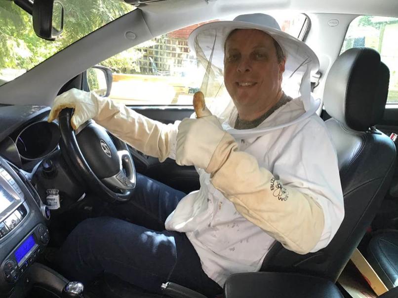 Bolton School bees have been moved off-site and are now in Mr. Butchart’s back garden. The hives had to be sealed up early in the morning before the bees started flying and packed into Mr. Butchart’s car. They were driven though Bolton and, as you can see from the picture, as Mr. Butchart was wearing his beekeeping gear, it attracted more than a few turned heads from people who clearly thought he had taken the PPE issue just a little too far! He took five hives home, which meant he had 25,000 bees in the back of his car!