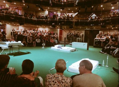 The staging is also well done, using the circular seating of the Exchange to its advantage. We see a green carpet, barely furnished by a table, two beds and a bathtub behind a transparent screen. It's