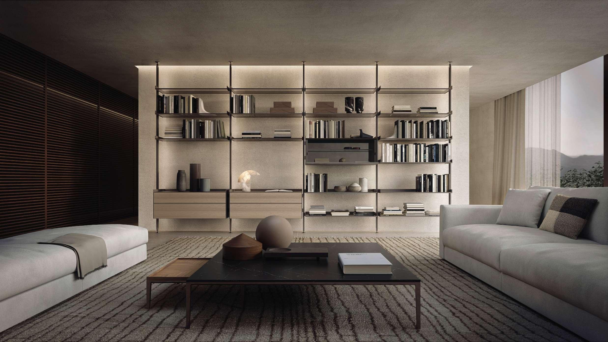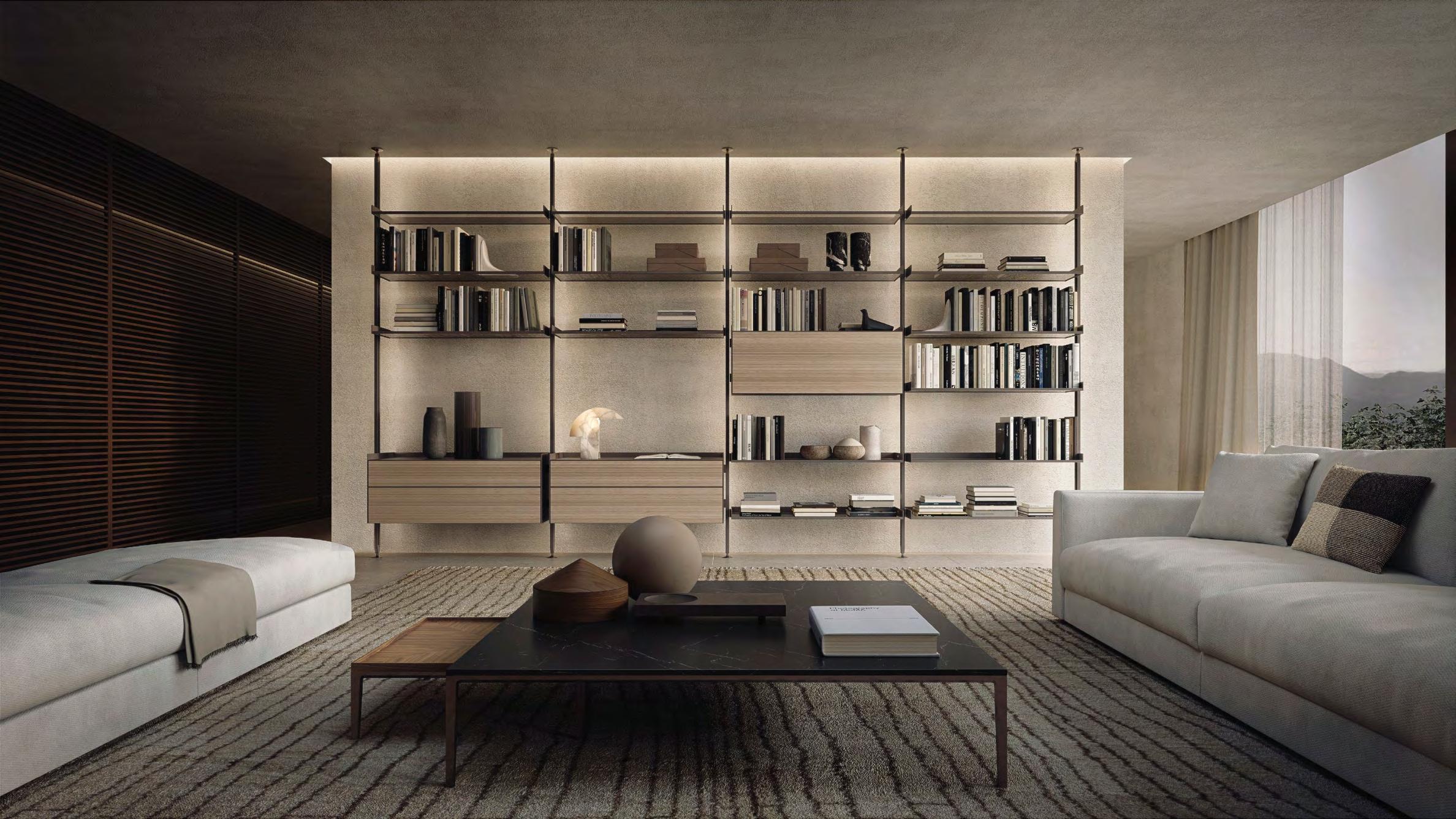 CASA E L’ AMPIA E LUMINOSA AREA LIVING. QUI, SUI LATI OPPOSTI DELLA ZONA DIVANI, SI FRONTEGGIANO UNA LIBRERIA INTERPARETE ZENIT E UNA COMPOSIZIONE SOSPESA A PARETE SELF PLAN. TRA LORO COMPLEMENTARI SUL PIANO FUNZIONALE, I SISTEMI CONTRIBUISCONO A DEFINIRE L’ORDINE