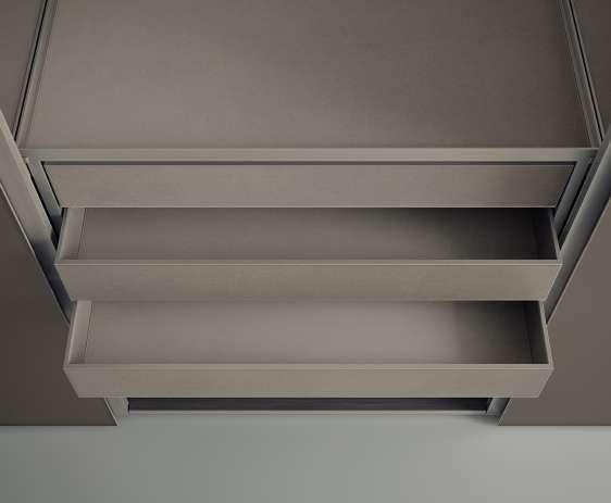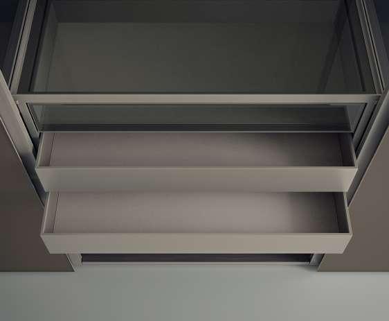 RU При работе с моделью Cover возможности дизайнеров существенно возрастают за счет появления линейки подвесных комодов для хранения с ящиками. Внутренняя поверхность ящиков может быть отделана тканью, в одном из 15 различных цветов, или синтетической кожей, в одном из 7 цветов; ящики предлагаются в двух вариантах высоты, а также четырех различных вариантах исполнения: открытый ящик без передней панели, ящик со стеклянной передней панелью, ящик с передней панелью из кожзаменителя, ящик с окрашенной передней панелью.