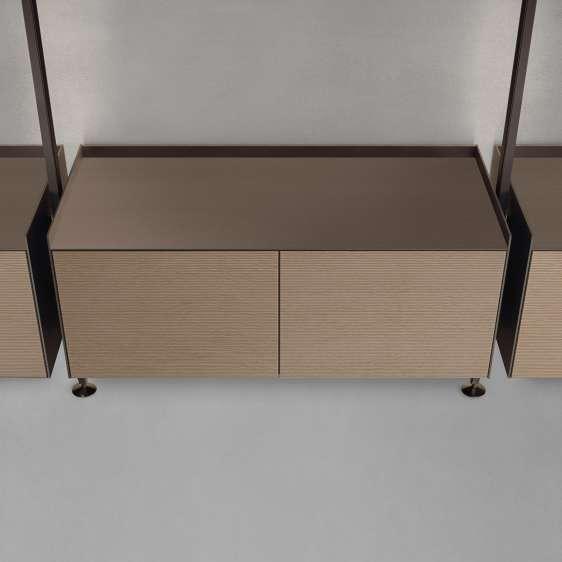 EN The Rimadesio materials collection is enriched with two new types of wood: oak and ebony-stained: oak and ebony-stained, both available in the new taiga finish. The surface is marked by a finely striped horizontal texture, obtained through a mechanical pressing process that gives the material a three-dimensional relief that is soft to the touch. In both essences, the taiga finish is available on 15 products in the collection: from the sideboards to the hinged doors, from the doors of the night storage units to the panels of the Modulor paneling system.