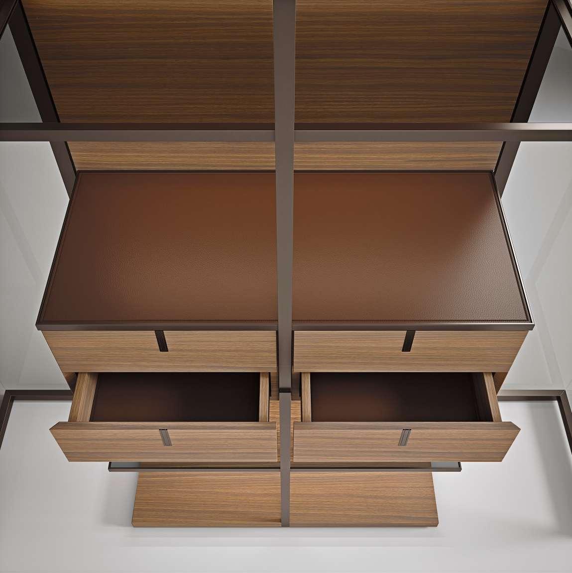EN Aluminium structural thicknesses are minimized so that the transpa rent glass and the integrated LED lighting system can best enhance the objects on display.The doors are made of reflective glass and equipped with a key locking system. The internal shelves are in transpa rent grey glass, the aluminium structure is in bronzo finishing. Top, base, backpanel and central drawer unit are in noce wood. The drawer unit’s top and and the drawers’ interior are equipped with synthetic leather available in 7 colours. The optional LED lighting is integrated under the shelves, top and drawer unit.