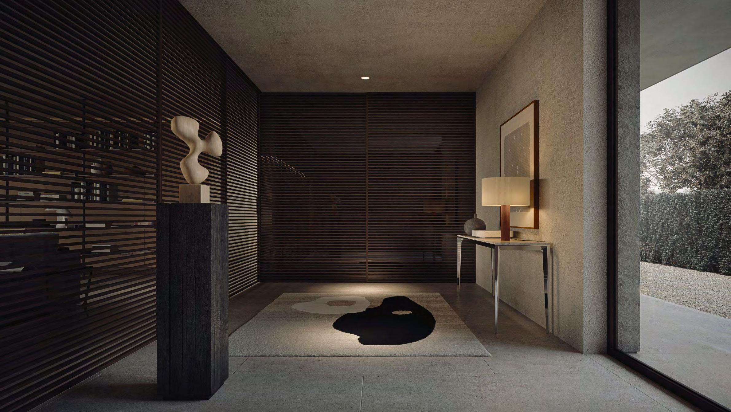 IT RIGOROSE NEL DISEGNO E PREZIOSE NEI MATERIALI, LE ANTE SCORREVOLI STRIPE COSTITUISCONO UN PRATICO SCHERMO TRA L’ AMBIENTE D’INGRESSO DELLA