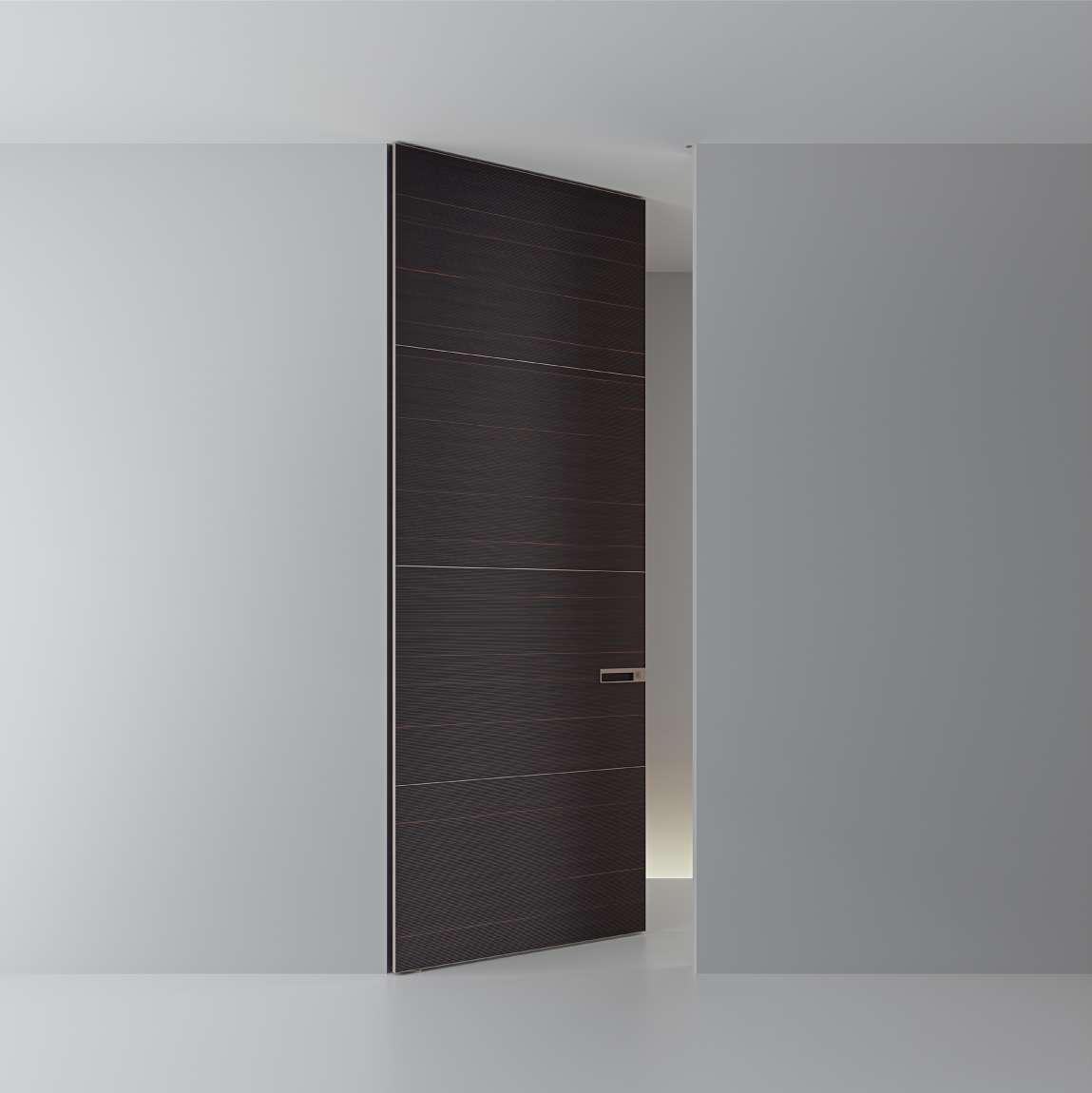 Realizzata sempre su misura in altezza e larghezza, Radius è capace di declinarsi su grandi dimensioni, con pannelli che raggiungono 3600 mm in altezza e 1760 mm in larghezza. E’ disponibile anche nella versione a doppio battente. La versatilità del prodotto permette l’installazione su parete senza stipite, con stipite a scomparsa dotato di profilo di chiusura magnetico, oppure integrata nella boiserie Modulor.