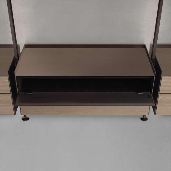 выполнены в отделке шпоном ореха, а топ модуля с ящиками и внутренняя поверхность ящиков обтянуты синтетической кожей: для данной модели предлагается 7 различных цветов. Модель предусматривает дополнительную опцию – светодиодную подсветку, которая может быть встроена во внутренние полки, топ и с нижней стороны модуля с ящиками.