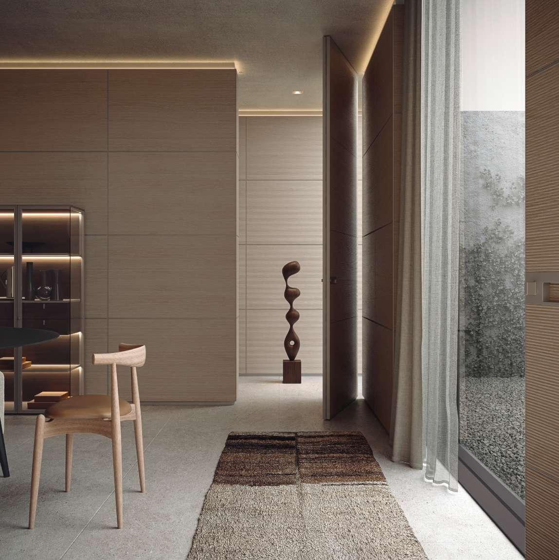 ON THE RADIUS DOORS, THE NEW TAIGA OAK FINISH EMBELLISHES YOUR DINING ROOM WITH ITS DELICATE GRAPHIC DESIGN. THE ROUND VERSION OF THE FRANCIS TABLE OCCUPIES THE CENTRE OF THE SPACE, WHILE TWO ALIANTE GLASS SIDEBOARDS EMPHASISE THE SYMMETRICAL LAYOUT ON THE SIDES. THE RESULT IS A BRIGHT AND COHESIVE ENVIRONMENT, WHERE NOTHING IS LEFT TO CHANCE – BE IT THE REFINED DESIGN OF THE VARIOUS FURNISHING COMPONENTS, THE TECHNICAL AND FUNCTIONAL QUALITY OF THE OPENING MOVEMENTS, OR THE SOPHISTICATED COMBINATION OF MATERIALS AND FINISHES.