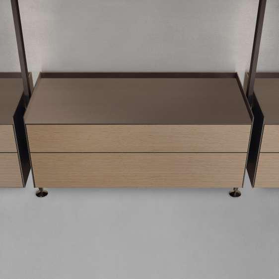 Zenit步入式衣柜,通过可自由摆放配置的悬挂式抽屉柜,扩展了自我的设计潜力。抽屉完全以 布料或合成皮覆面,可有两种高度以及四种美学版本的选项:开放式无正面面板的抽屉、玻璃正面 面板抽屉、合成皮正面面板抽屉以及烤漆正面面板抽屉。同样的在步入式衣柜的版本中,也可选用 带背光照明的支撑结构。