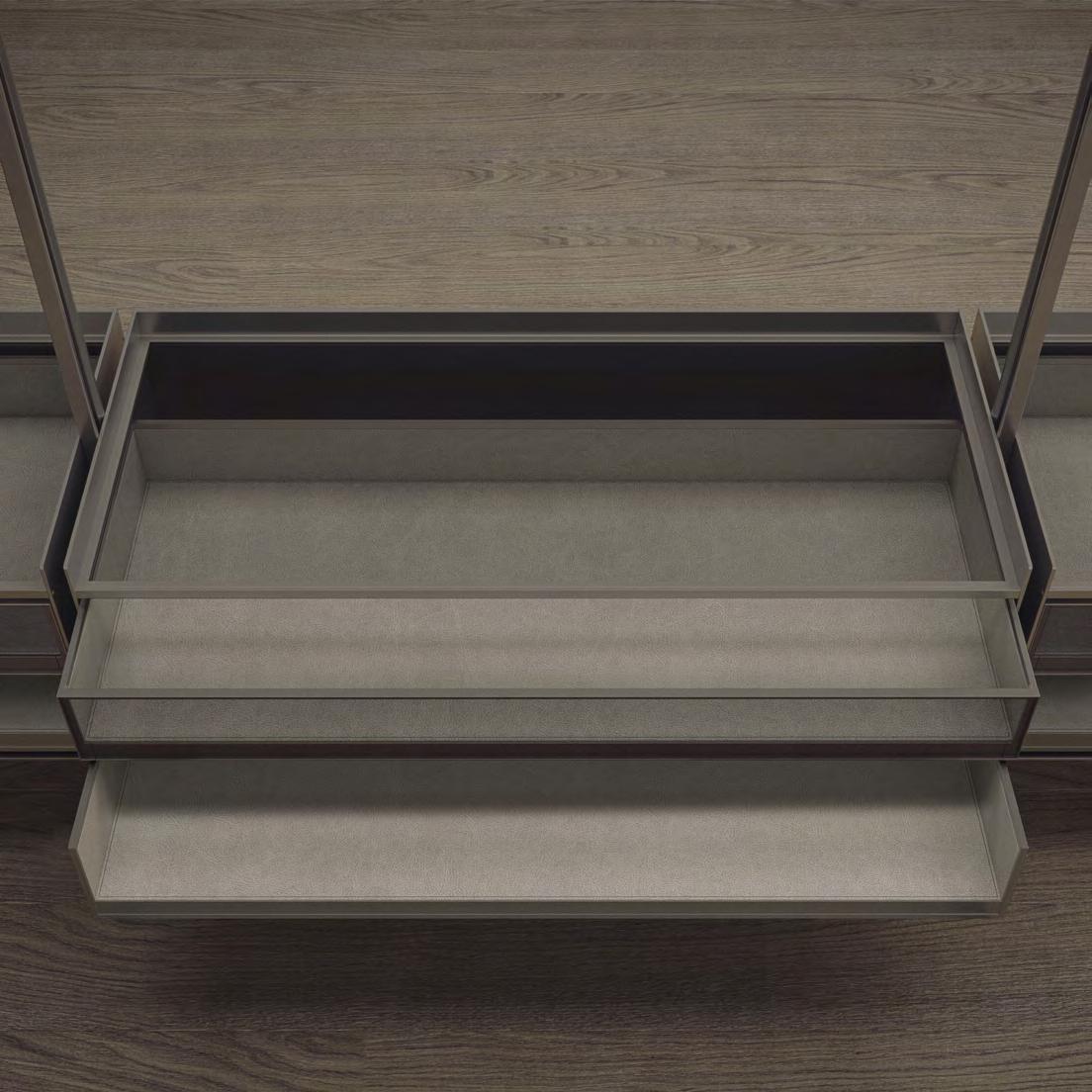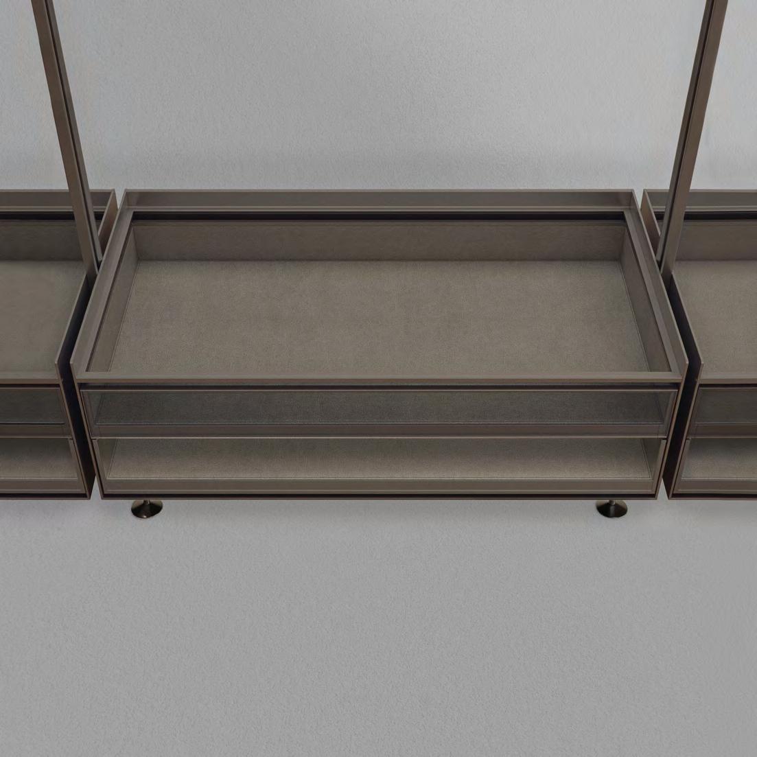 struttura/structure: 303 bronzo vetro/glass: 67 riflettente chiaro ripiani interni in vetro/glass internal shelves: 63 grigio trasparente top cassettiera in similpelle/