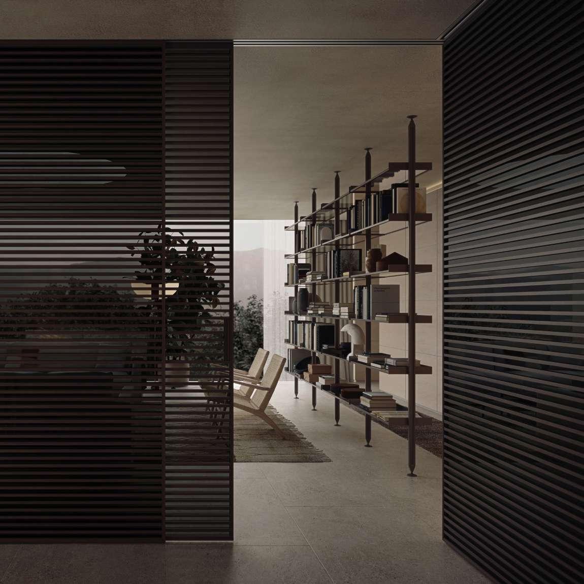 EN RIGOROUSLY DESIGNED WITH PRECIOUS MATERIALS, STRIPE SLIDING DOORS FORM A PRACTICAL SCREEN BETWEEN THE HOUSE ENTRANCE AREA AND THE LARGE, BRIGHT LIVING AREA. HERE, ON THE OPPOSITE SIDES OF THE SOFA AREA, A ZENIT BOOKCASE AND A SELF PLAN WALL-HUNG STRUCTURE FACE EACH OTHER. PLAYING MUTUALLY COMPLEMENTARY FUNCTIONS, THE SYSTEMS HELP TO DEFINE THE COMPOSITIONAL ORDER AND STYLISTIC MODERNITY THAT CHARACTERISE THE SPACE.